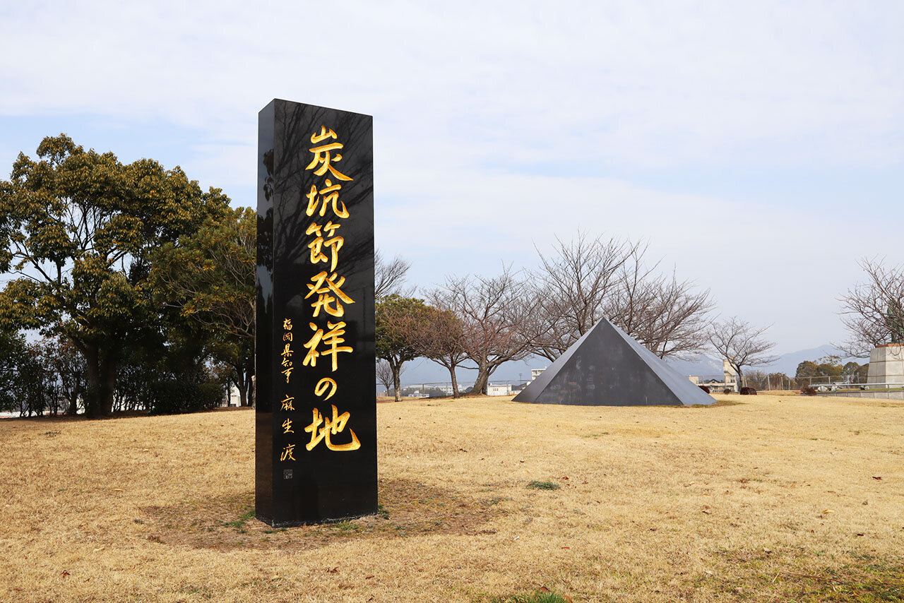 炭坑節は田川で生まれ、三池炭坑などの県内、そして全国へと広がったのだそう。園の入口には「炭坑節発祥の地」の碑と、炭坑節の歌詞を刻んだ石碑も立っています。