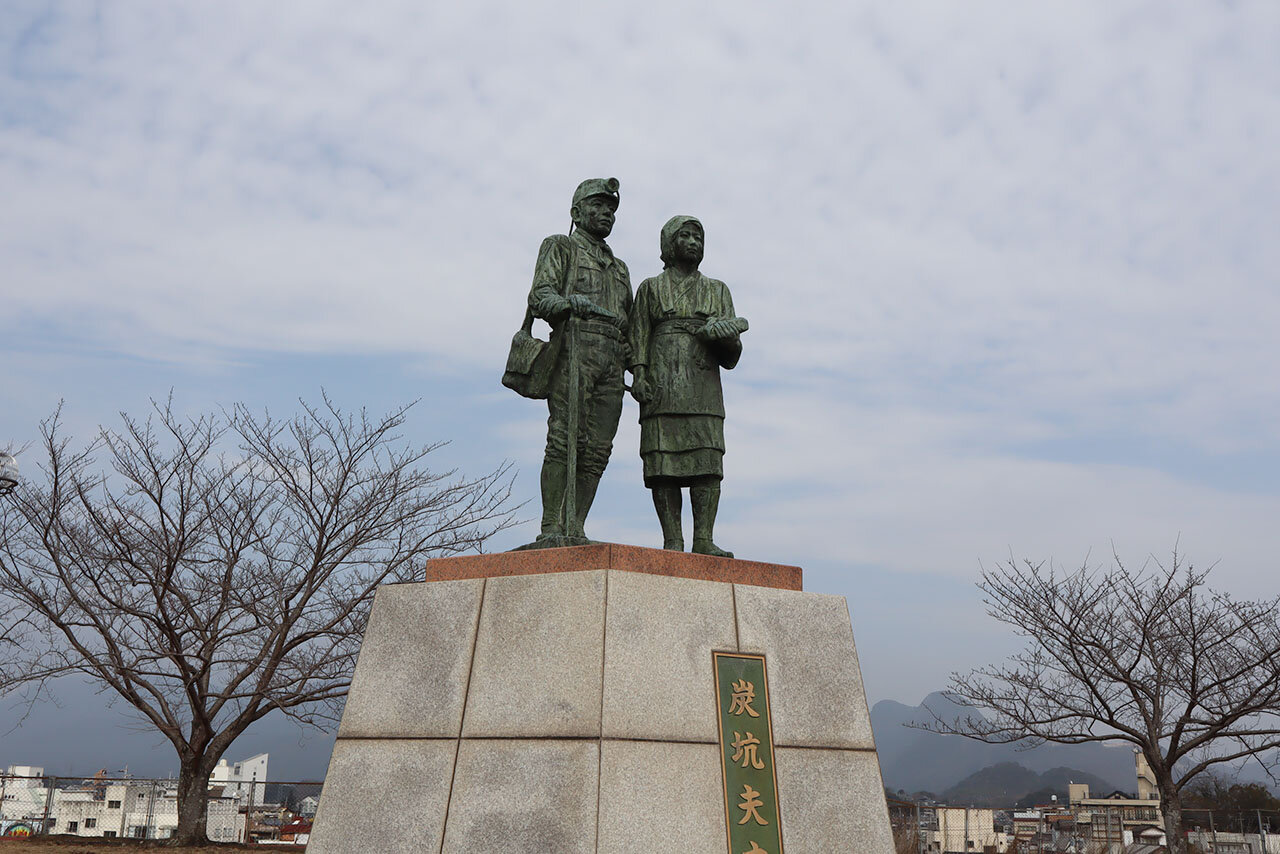 煙突を眺めるように立つ「炭坑夫之像」