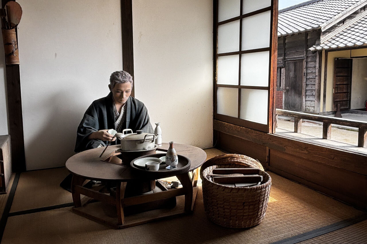 昭和の住居の中では、炭坑夫の人形が晩酌を楽しんでいました! 土間では妻の人形が家事をしていて、2人に近づくと、とある音声が流れてきます。