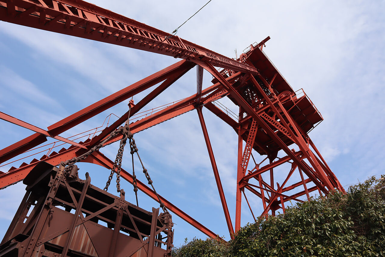 真下から見上げる竪坑櫓は、大迫力! かつての日本の近代化を支えた炭坑の象徴だけあって、今なお頼もしさが感じられます。