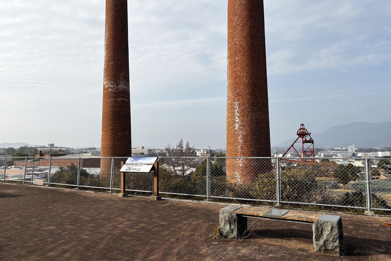 園内にそびえる高さ約28メートルの「伊田竪坑櫓」と、高さ45.45メートルの「伊田竪坑第一・第二煙突」は、炭都・田川のランドマーク。“ヤマ”(炭坑)の様子を伝える産業遺産として、今に残っています。