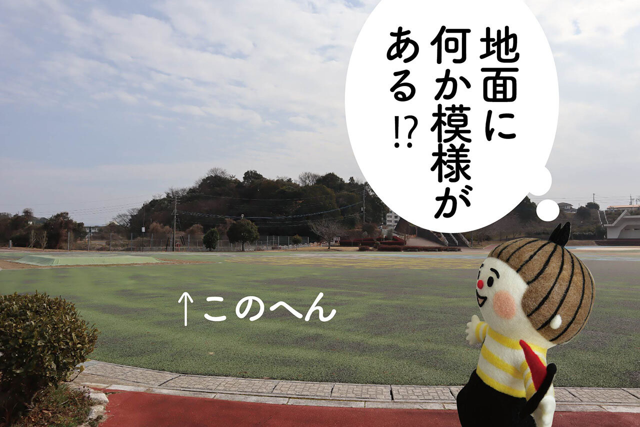 広場に何か色が付いているのが、分かりますか? ここにはなんと、月と二本煙突の大きな地上絵が描かれているそうです。