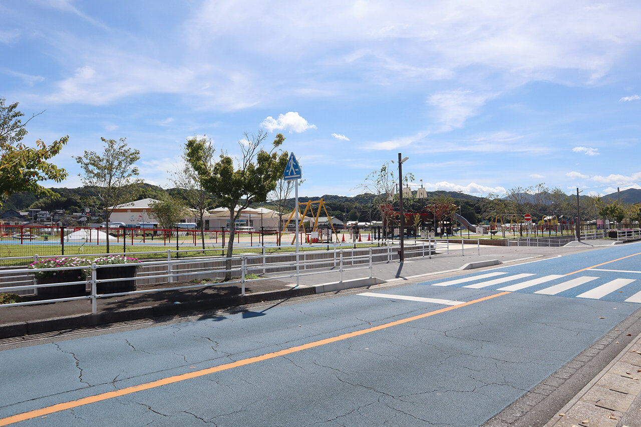物産館やフードコートが入る「もみじ館」から見ると、2025年春に新設された「ふれあい広場」は、桜街道を挟んだ向かい側。メイン駐車場からは横断歩道を使って渡ることになります。