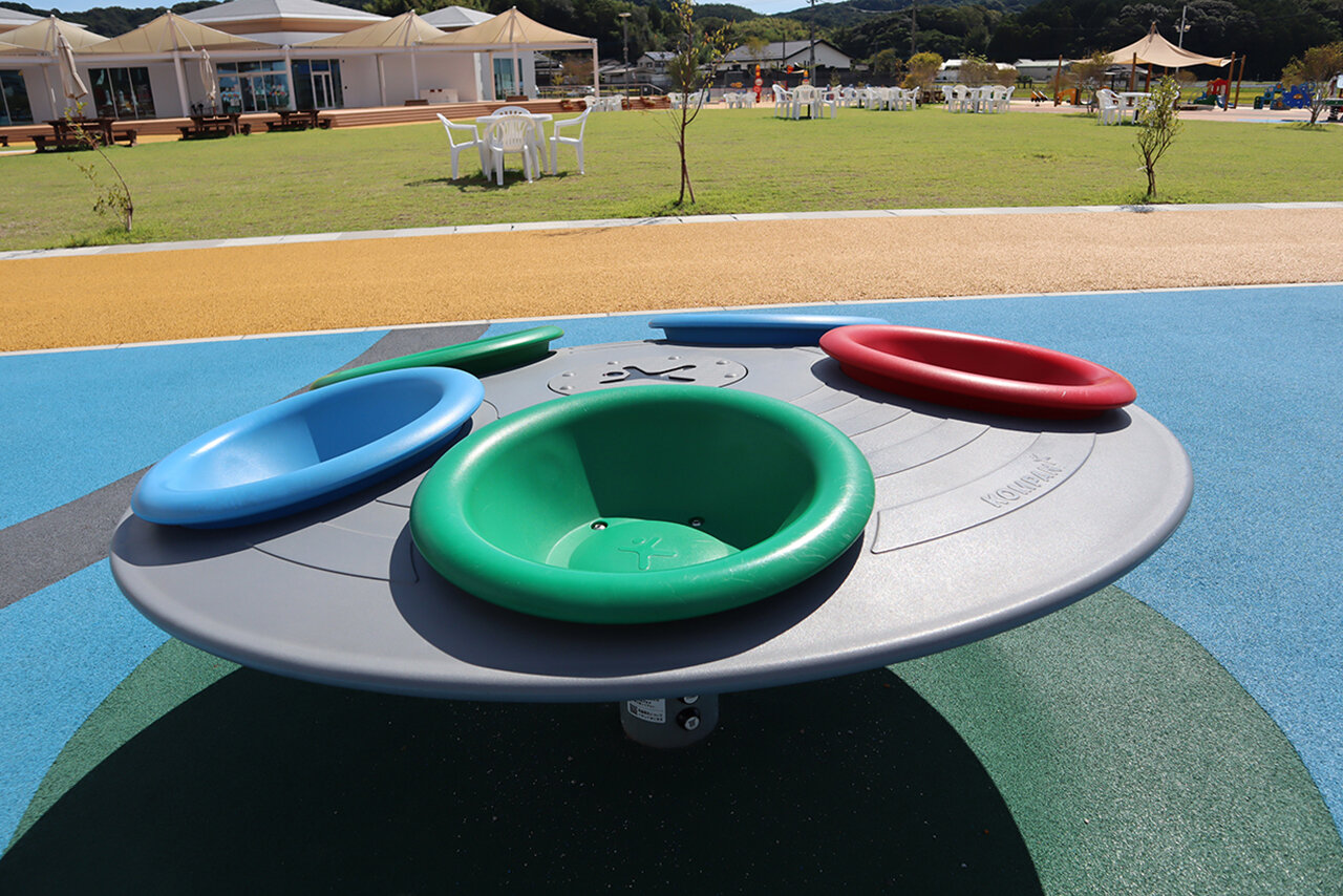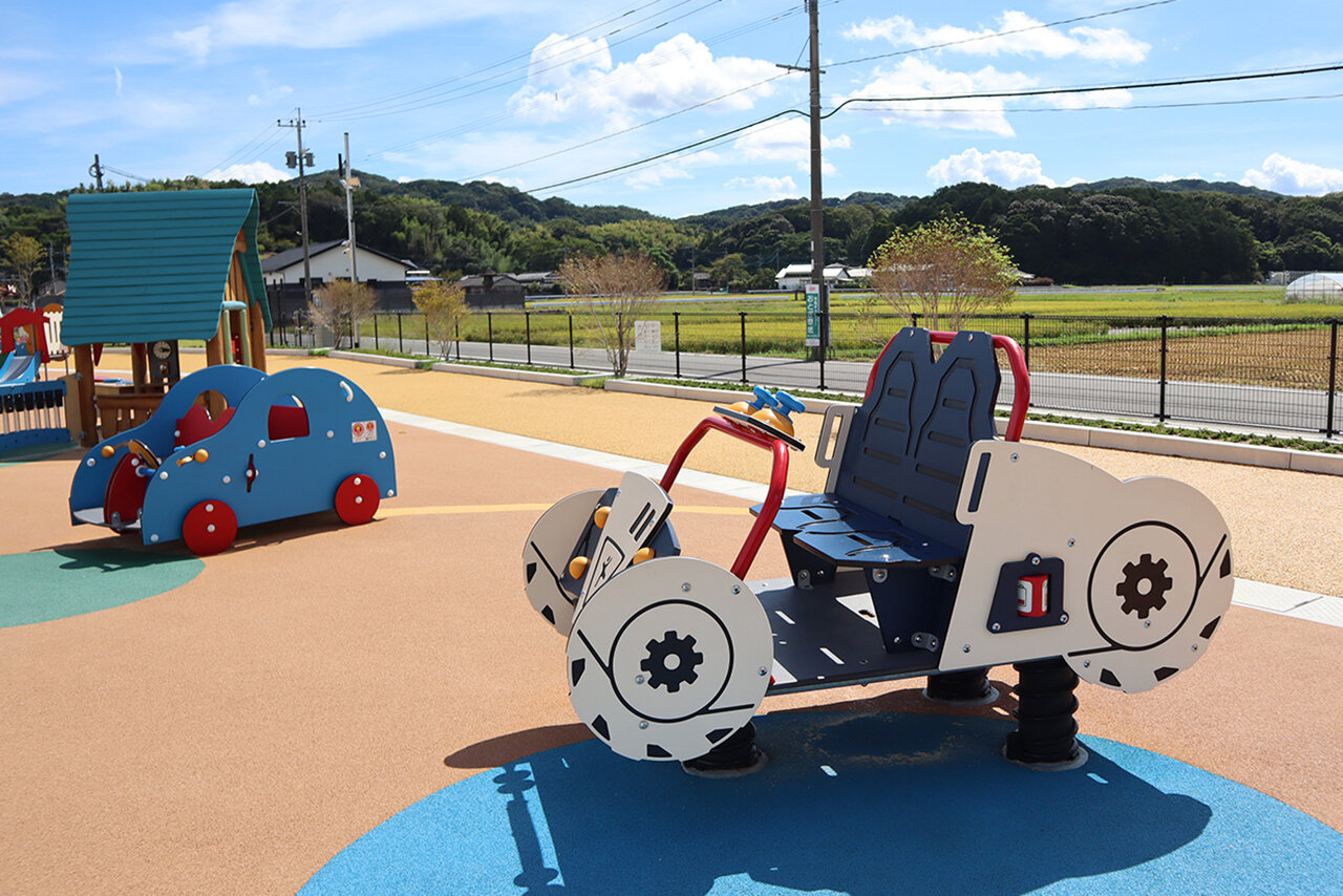 複数人用のブランコや回転遊具、かっこいいデザインの車型遊具など、ちびっこが集まってワイワイ遊ぶのにぴったりの遊具もあり、居合わせたみんなで遊ぶことができます。