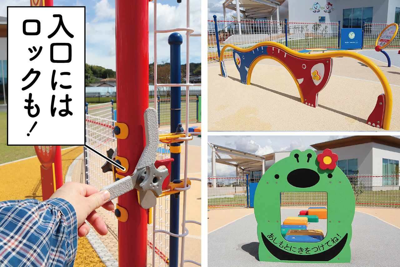 遊具の周りの舗装はゴムチップ。見た目もにぎやかで、転んだときの衝撃も軽減してくれますよ。