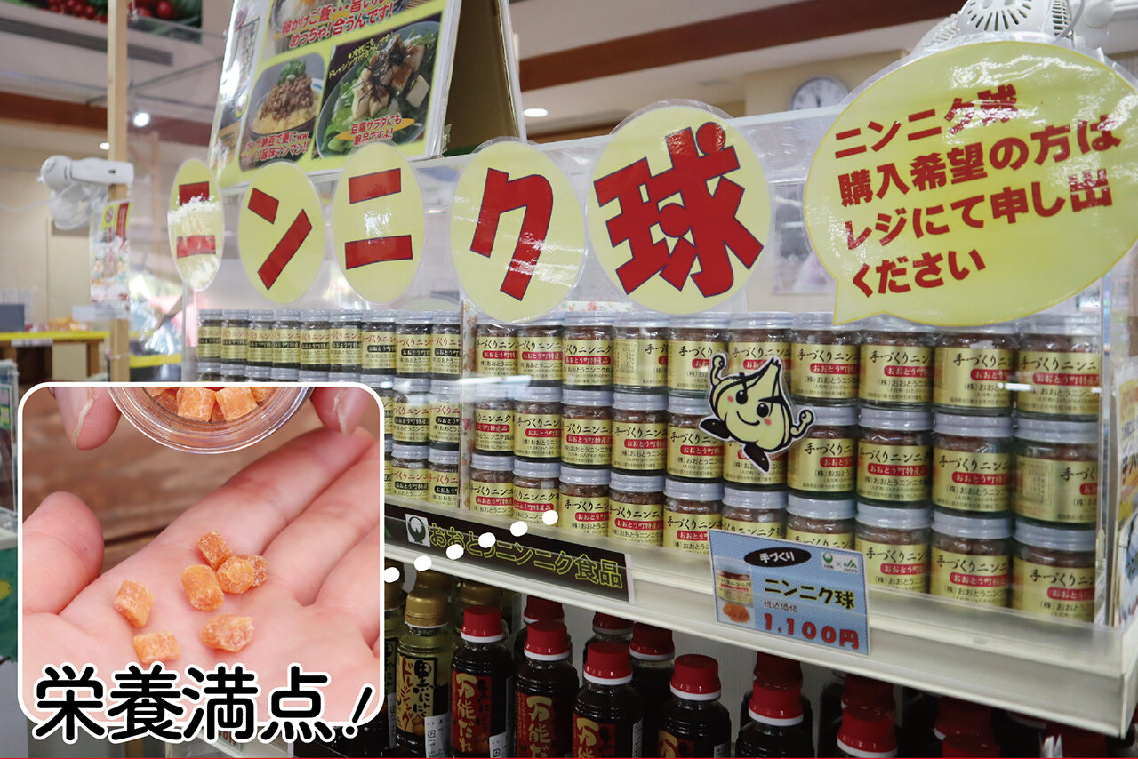 加工品のなかでも特に人気が高いのは、ニンニクをそのまま使う手作りの「ニンニク球」。元気がつくと評判です。