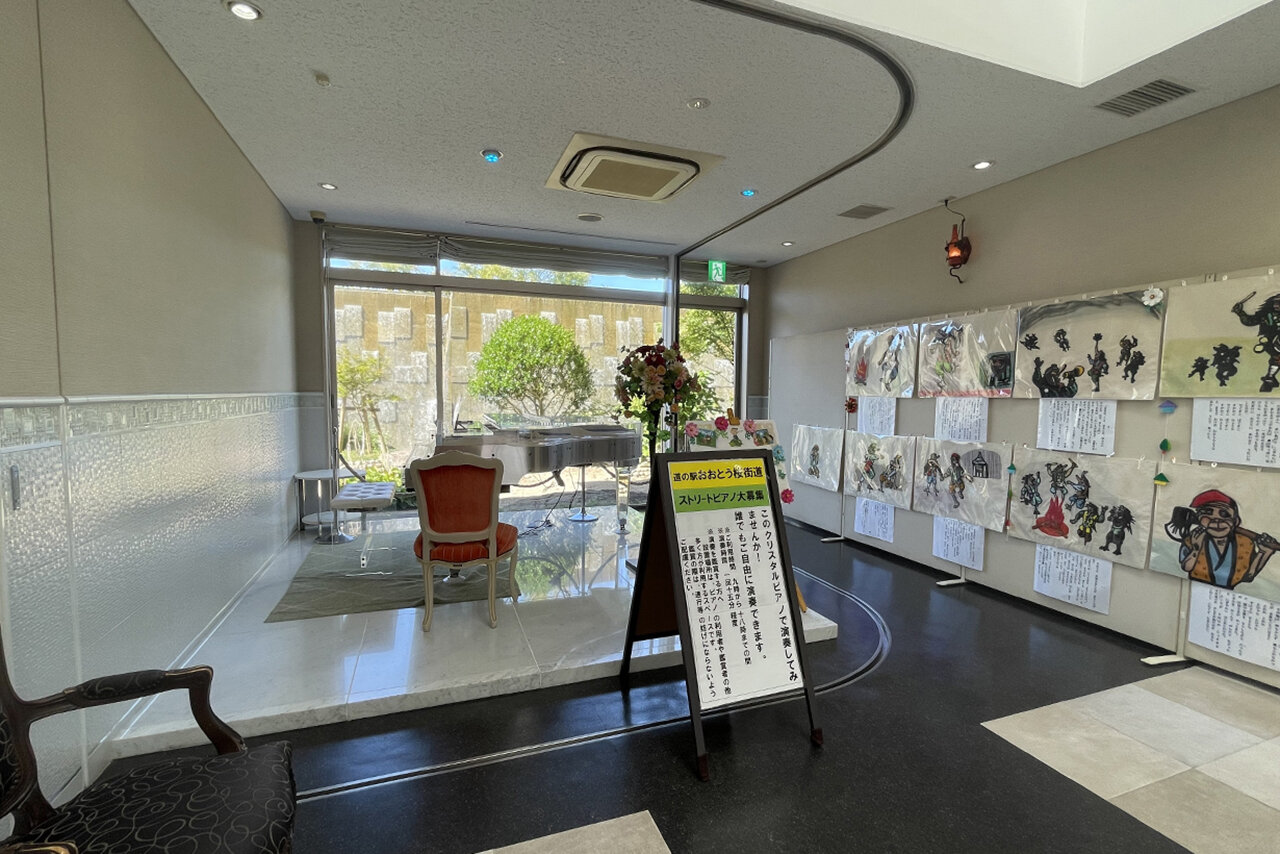 一億円トイレに隣接するホールには、誰でも自由に演奏できる“ストリートピアノ”として設置された、ゴージャスなクリスタルピアノが目を引きます。