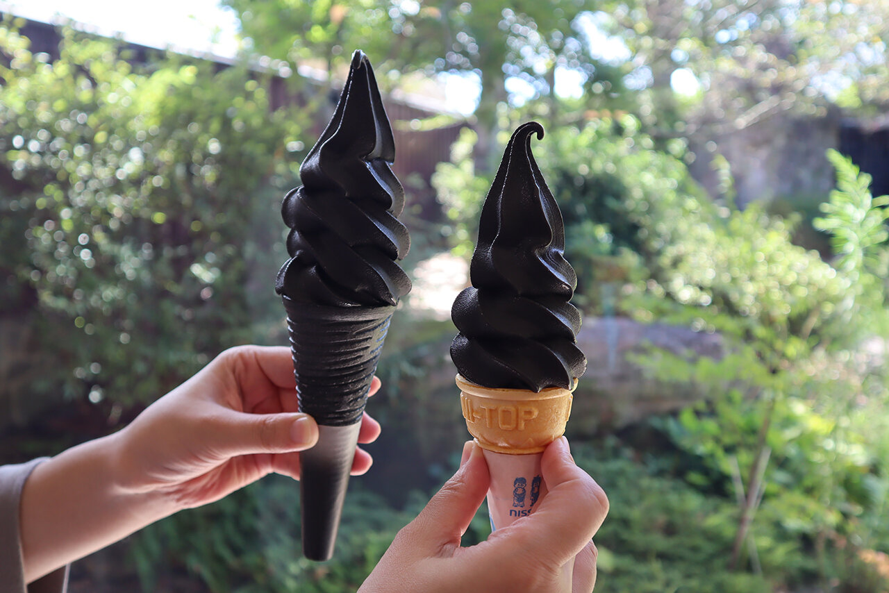 炭鉱の町では、スイーツも個性的。見てください! この真っ黒なソフトクリームは「石炭ソフト」。小さい子も大好きなチョコレート味ですが、食べると舌が黒く染まって、それもまた愉快な思い出に。