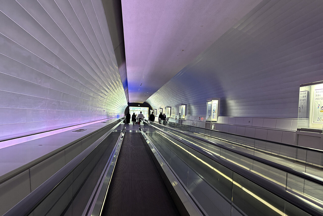 お隣の太宰府天満宮からは、長いエスカレーターと動く歩道を使ってアクセスできます。カラフルな光が彩る動く歩道は、まるでタイムトンネル。入館前のワクワク感を演出してくれます。