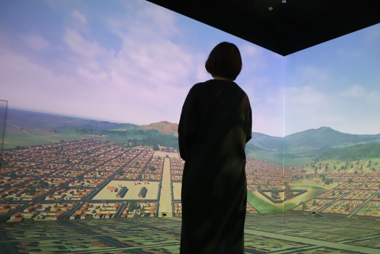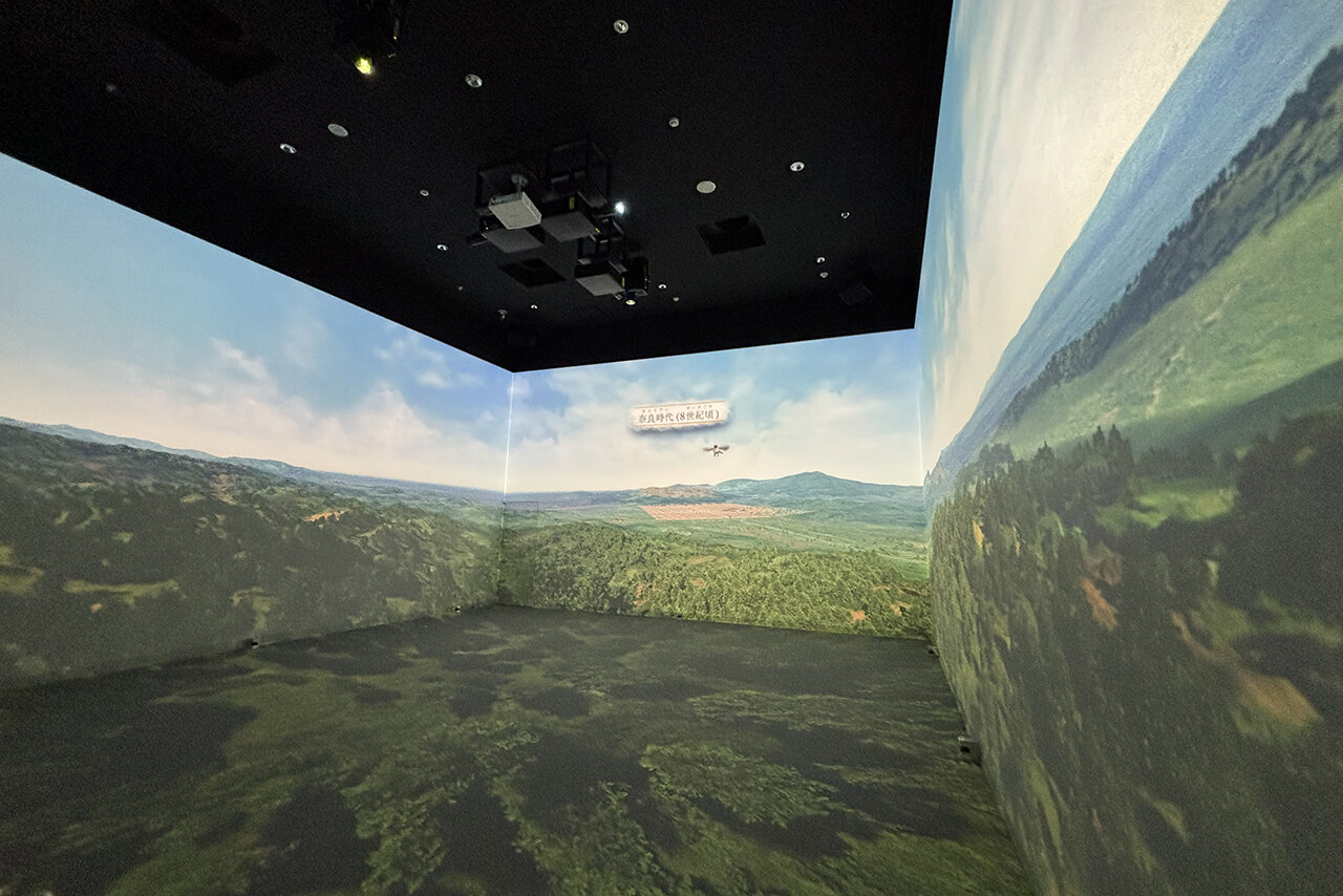 「太宰府タイムトリップ」は、正面と左右の壁、そして床の4面に投影される映像空間に飛び込んで、奈良時代にさかのぼる太宰府の歴史ドラマを体感できる、迫力のコンテンツ。