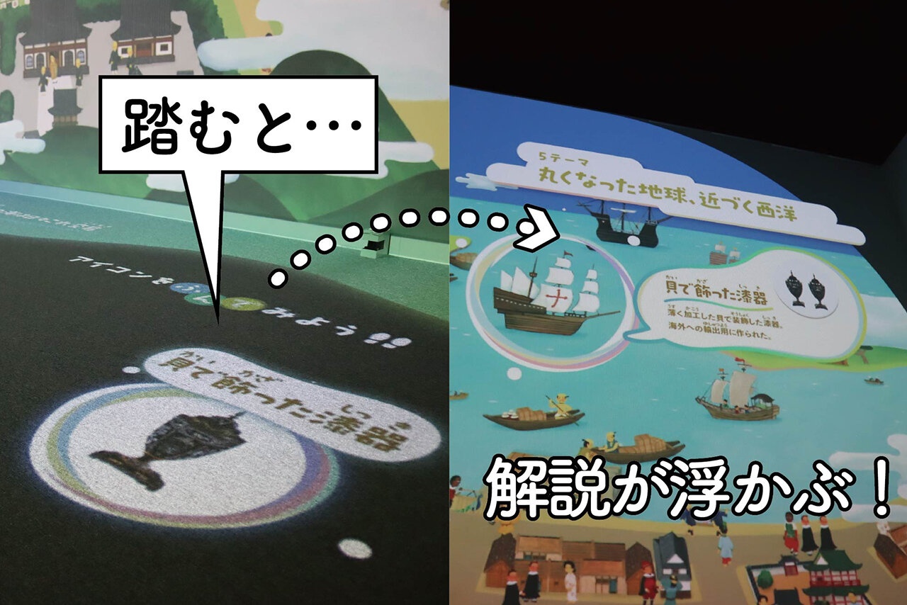 そして、もう一方の「キューハクふむふむ」は、床に投影された動くアイコンを踏むことで壁に解説が浮かび上がる、インタラクティブな仕掛けが楽しいコンテンツ。