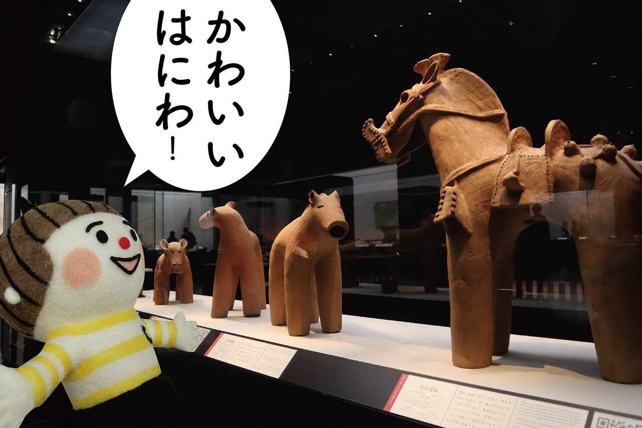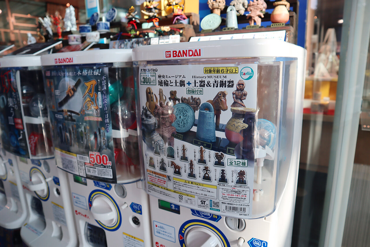 ショップの表に並ぶカプセルトイは、はにわに刀剣、仏像のミニチュアなど、博物館ならではの品ぞろえ。