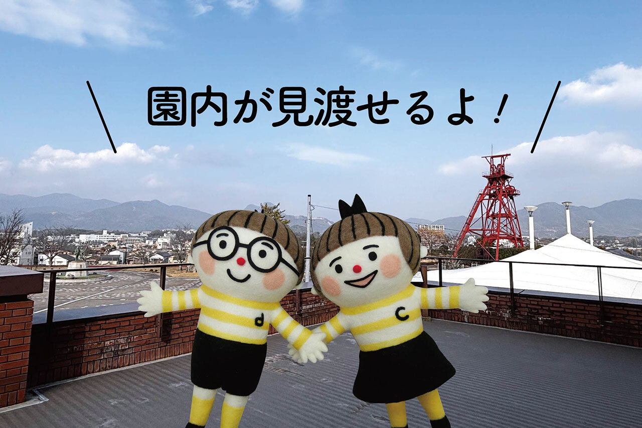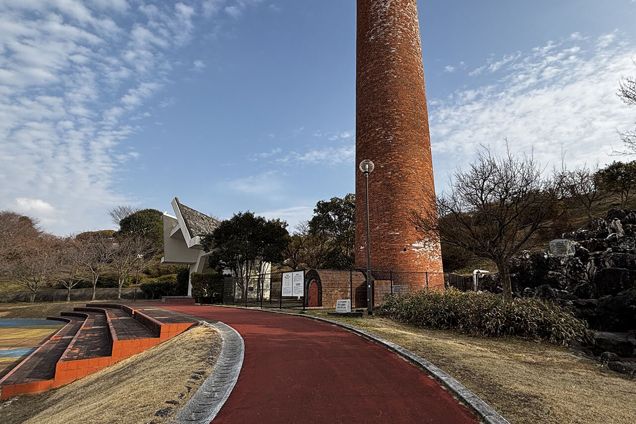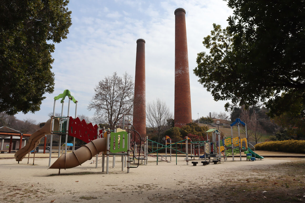 園内にそびえる高さ約28メートルの「伊田竪坑櫓」と、高さ45.45メートルの「伊田竪坑第一・第二煙突」は、炭都・田川のランドマーク。“ヤマ”(炭坑)の様子を伝える産業遺産として、今に残っています。