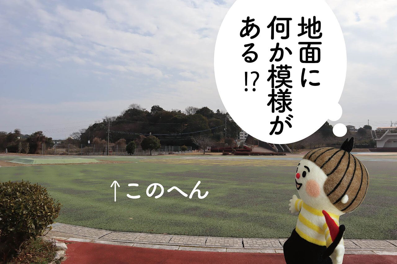 広場に何か色が付いているのが、分かりますか? ここにはなんと、月と二本煙突の大きな地上絵が描かれているそうです。