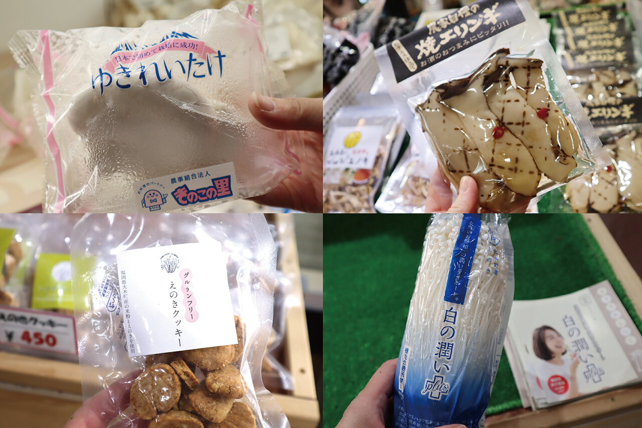 「焼エリンギ」や「えのきクッキー」など、大木町らしいきのこの加工品も。