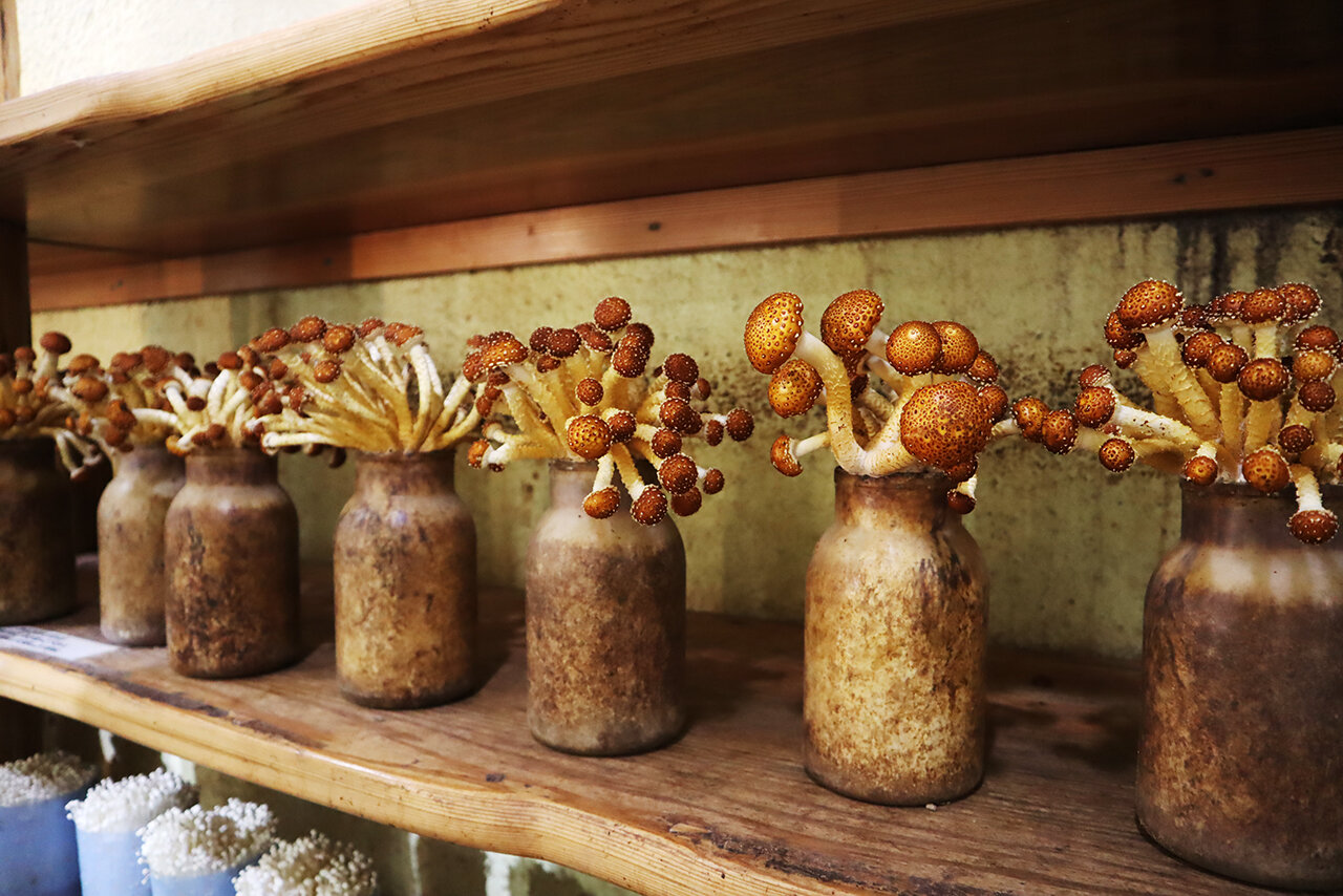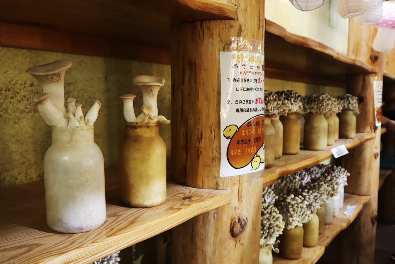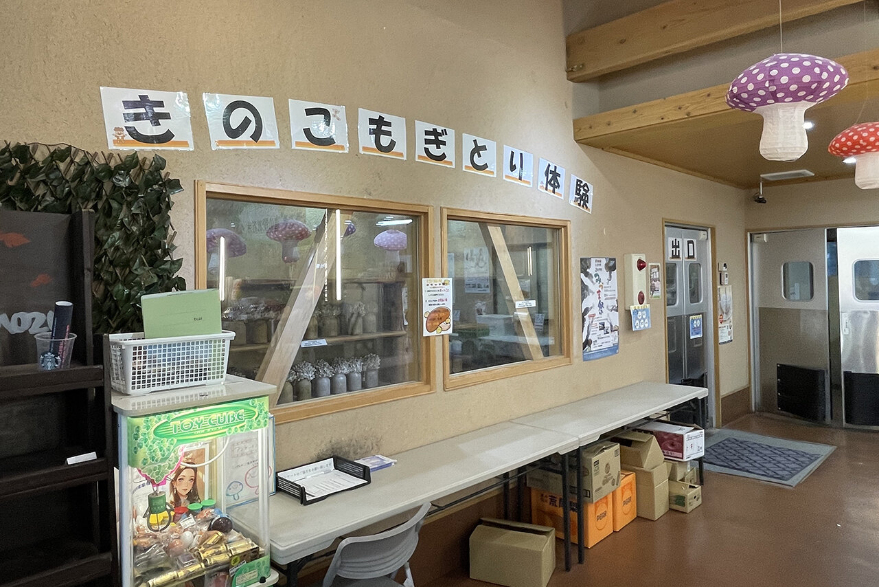 くるるん夢市場内でひときわ気になる「きのこもぎとり体験」の表示。中を覗くと、きのこがニョキニョキと生えた栽培ポッドが棚いっぱいに並んでいます。