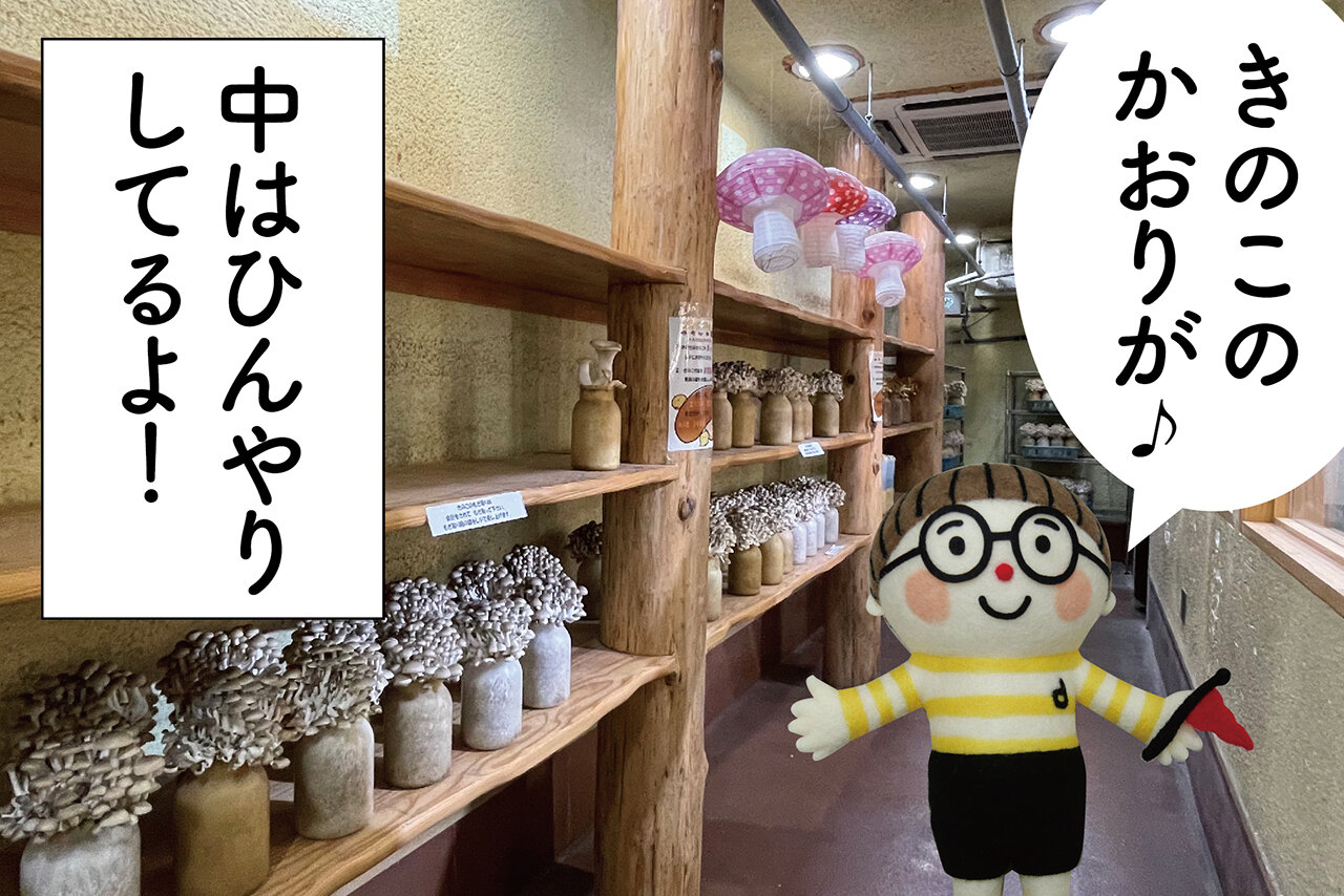室内はきのこの生育に適した温度・湿度に調整されていて、入った途端に、ひんやり冷たい空気と、きのこの香りに包まれます。