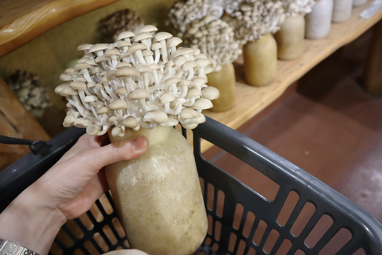 好きなきのこを選んだら、ポットのまま買い物かごに入れていきましょう。同じ種類のきのこでもポットごとに太さや本数が全く異なり、選ぶのも楽しい時間です。