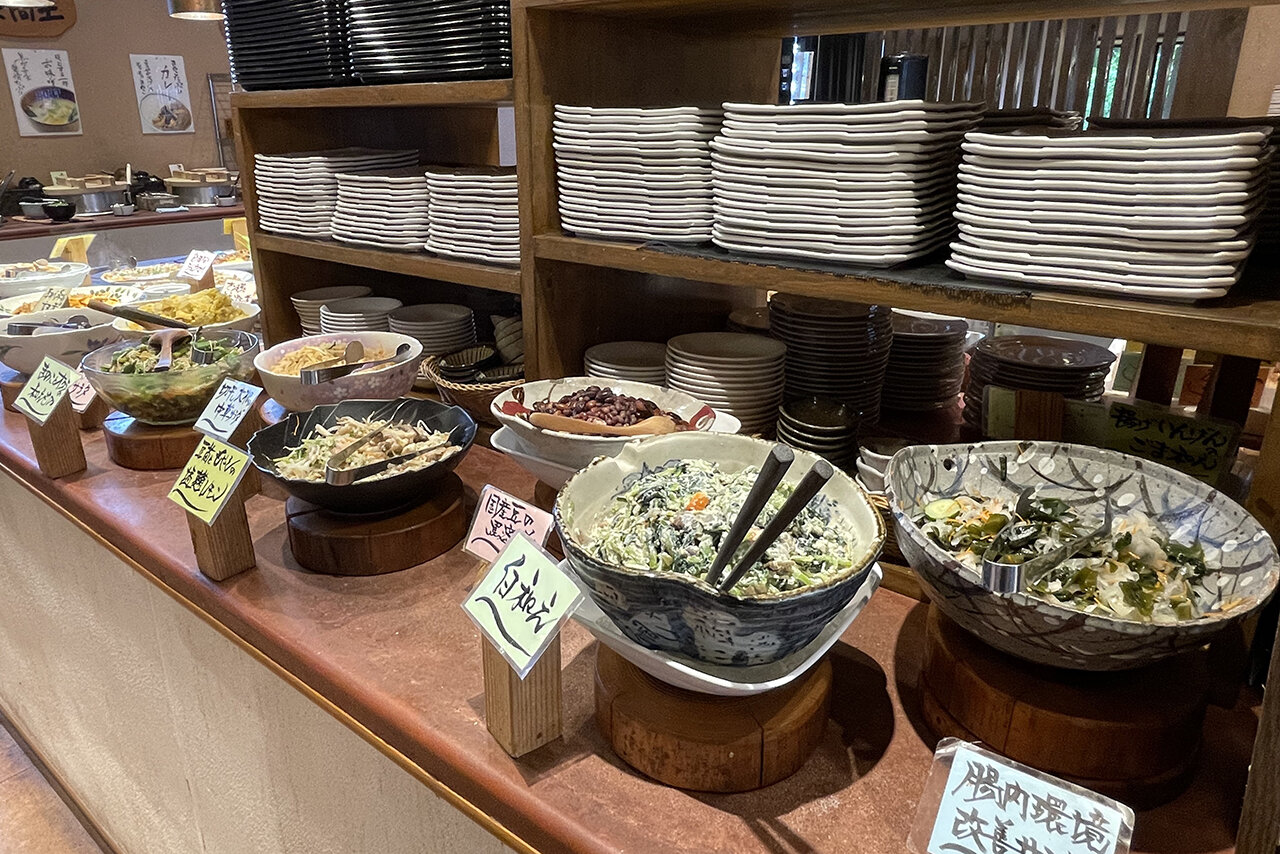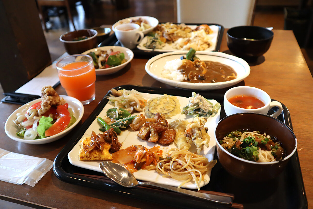明るい店内には、近隣で採れた旬の食材にこだわる約50種類もの料理が所狭しと並びます。きのこと野菜がたっぷり使われてるものばかりで、どれもおいしそう!