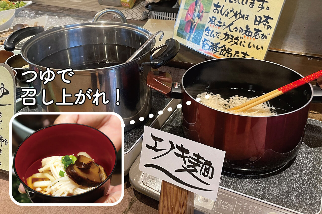 きのこの里ならではの「エノキ麺」は、ゆでたえのきだけをうどん麺とつゆでいただくアイデア料理。