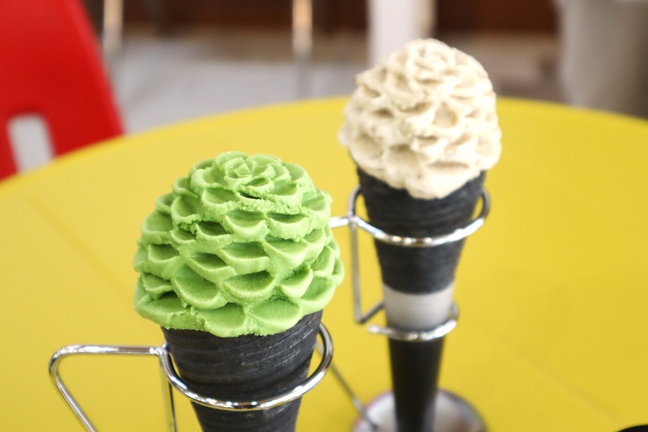 くるるん夢市場で人気の「えのきのり佃煮」を使ったジェラートは、甘さの奥にビターな風味を感じるハマるおいしさ! “追い佃煮”をしながら食べることができます。