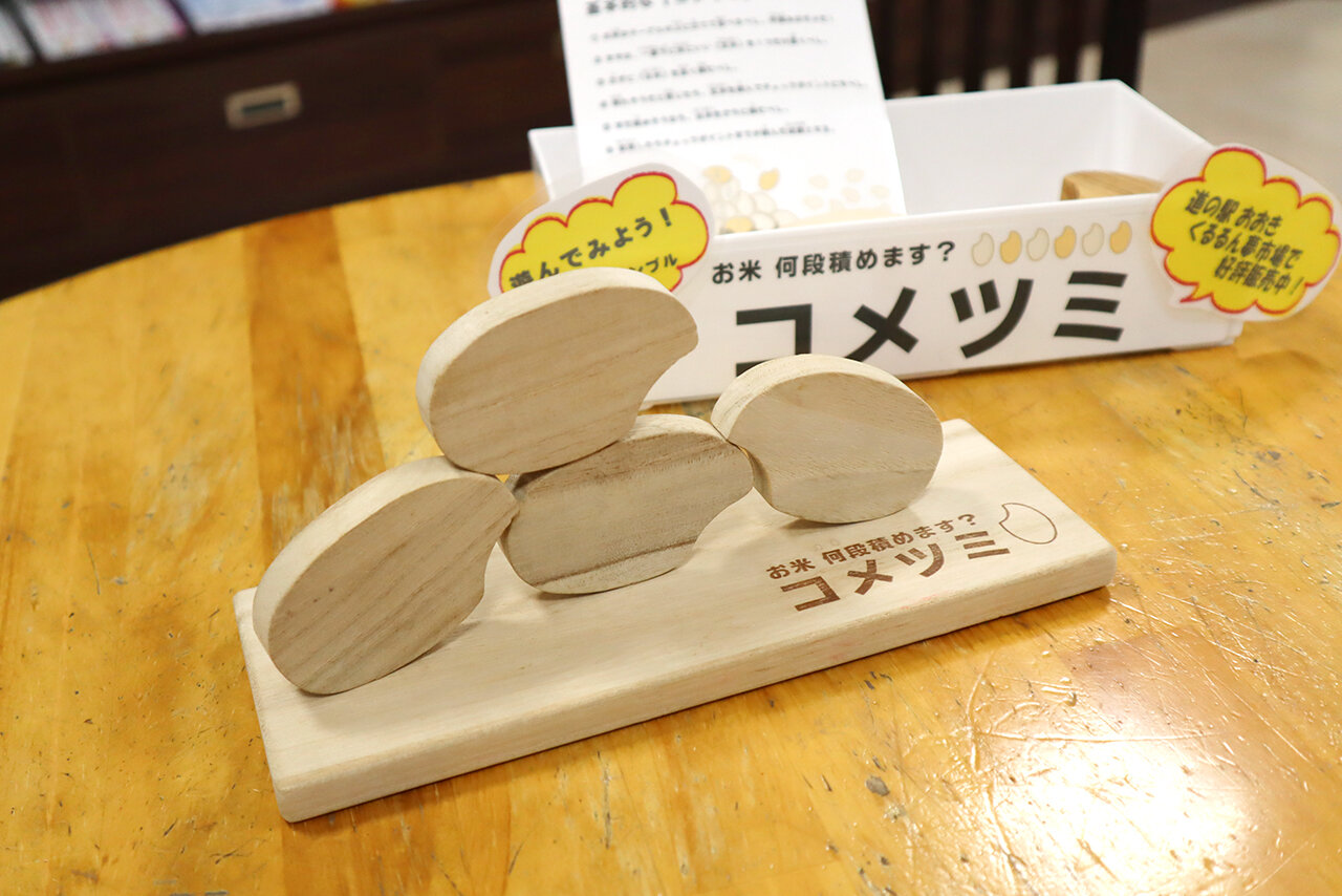 自由に押せる道の駅スタンプや近隣の観光パンフレットなどが用意されるほか、木の手ざわりが気持ちいバランスおもちゃ「コメツミ」で遊ぶこともできますよ。