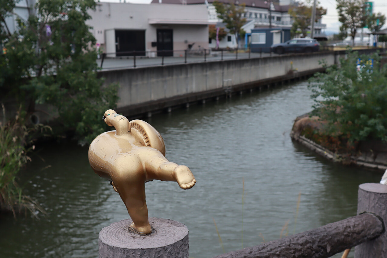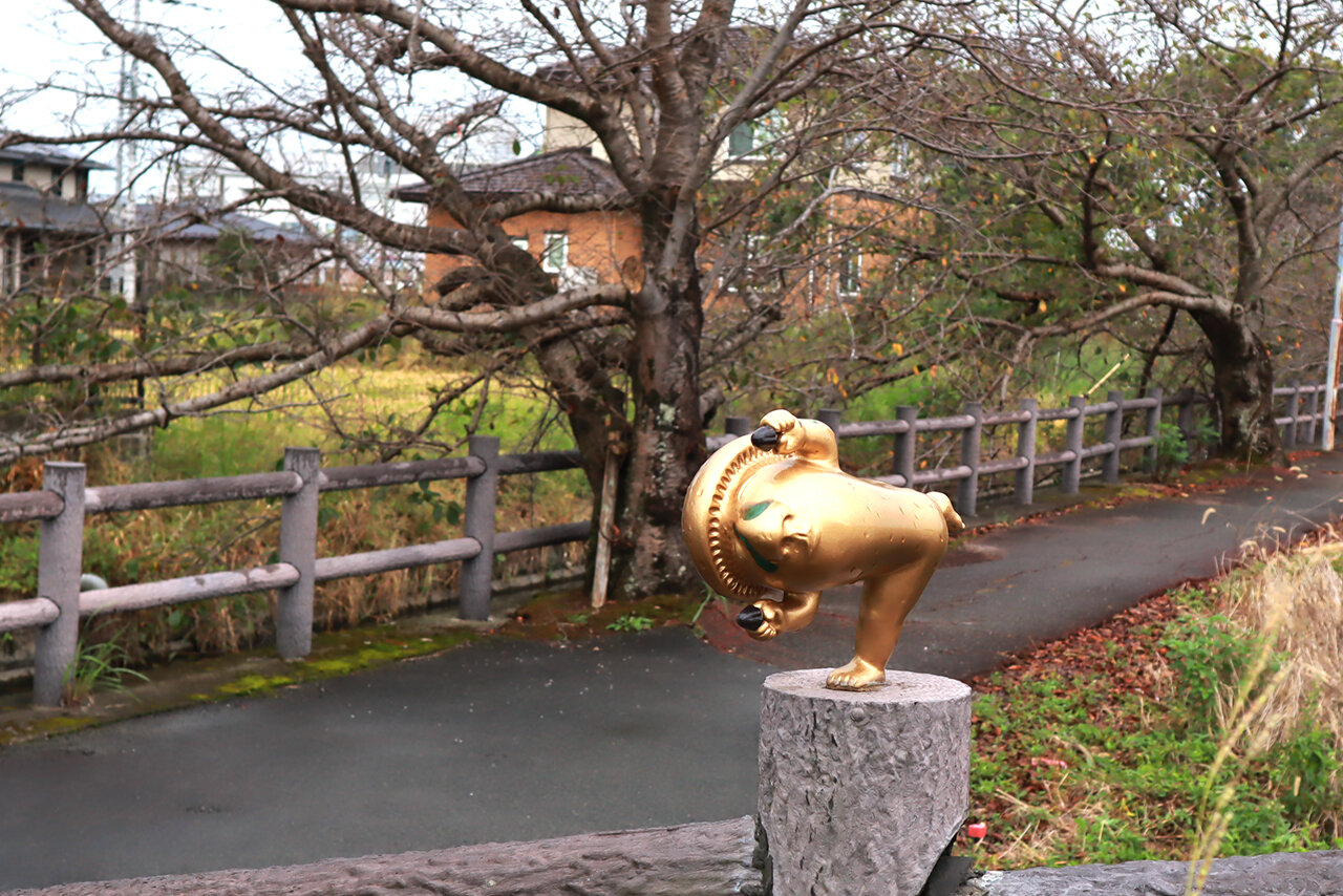 まず、道の駅おおきから歩いて15分ほどのクリーク端でポーズを決めているのが、“プリけつの黄昏きの子”の名前で知られる小ぶりの子。