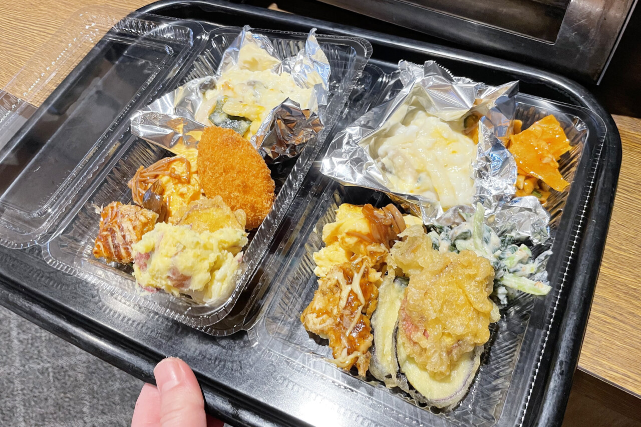 パック代は別で、小パックと中パックが各10円、仕切りパックが50円です。持参したマイ容器に詰めるることもできますよ。