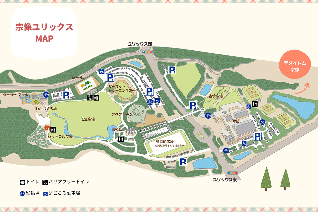 2025年12月にオープンした「全天候型こども広場Mu-Mo」は、多彩な施設が散在する大きな総合公園・宗像ユリックスの敷地内にあります。約28万平方メートル(みずほPayPayドーム福岡約4個分!)というとっても広~い公園です。駐車場は7カ所に分かれているので、お目当てのスポットから近い駐車場をチェックしてから出かけるのがおすすめ。今回Mu-Moに近い「P5」駐車場に車を停めました。