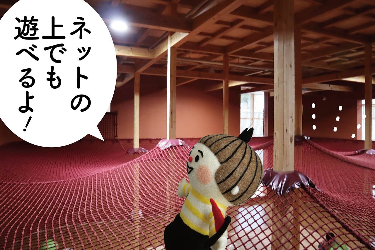 頭上のネットに上って遊ぶこともできますよ。飛び跳ねて楽しむもよし、親子で寝転んでまったり過ごすもよし。子どもはもちろん、大人も童心に帰ってワクワクできるスペースです。