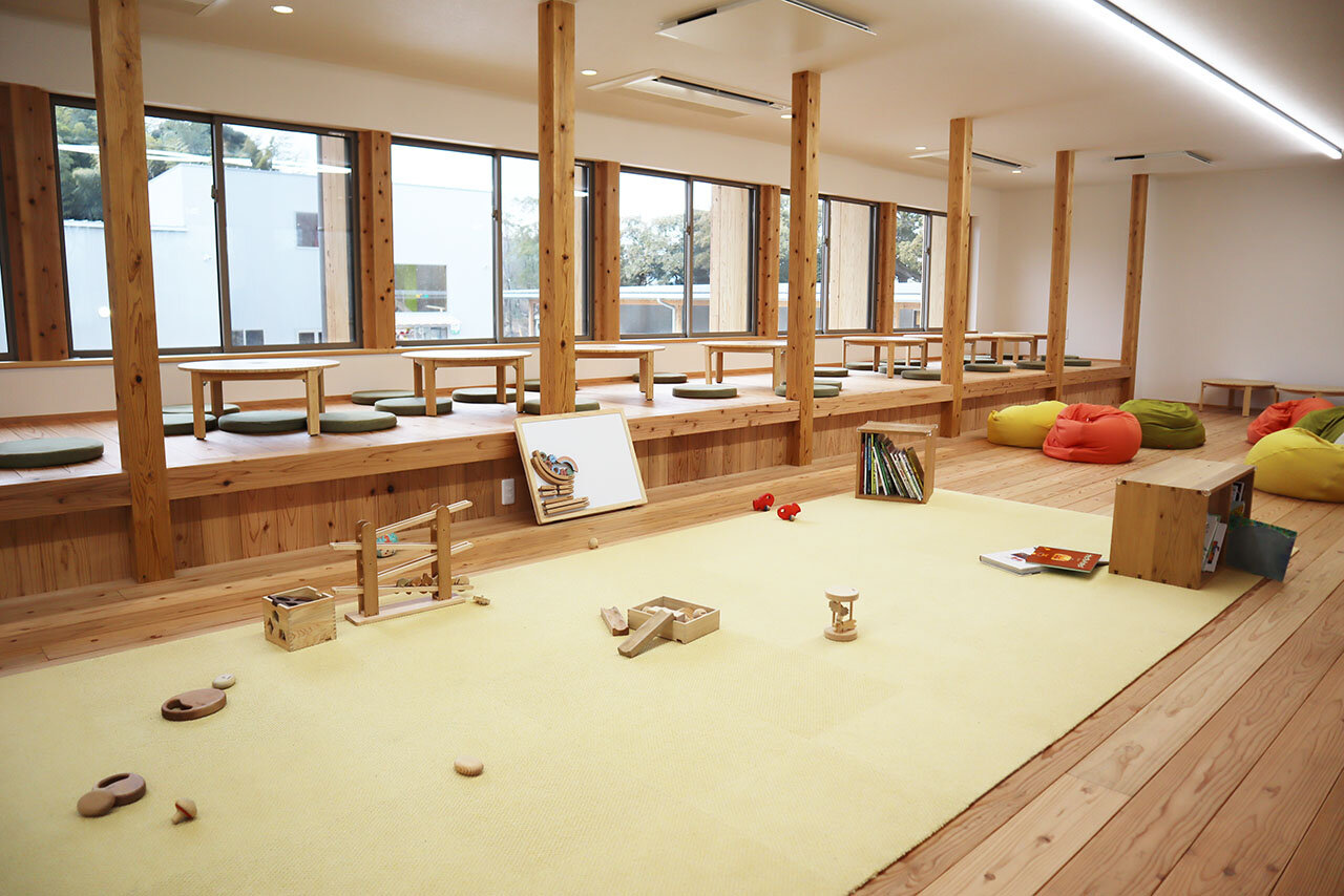 建物には国産木材がふんだんに使われているそうで、入るとすぐに木の香りに包まれます♪ 無垢材の床も、裸足の足に心地のいい肌ざわり。