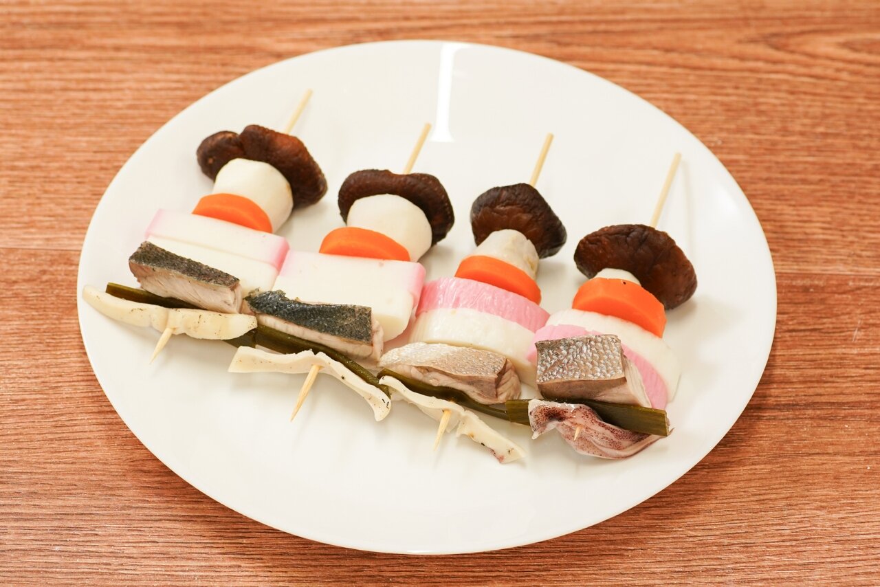 6. (5)から干し椎茸を取り出して半分にカットし、スルメ、昆布、下茹でしたぶり、かまぼこ、⾥芋、⼈参を串刺しにする。