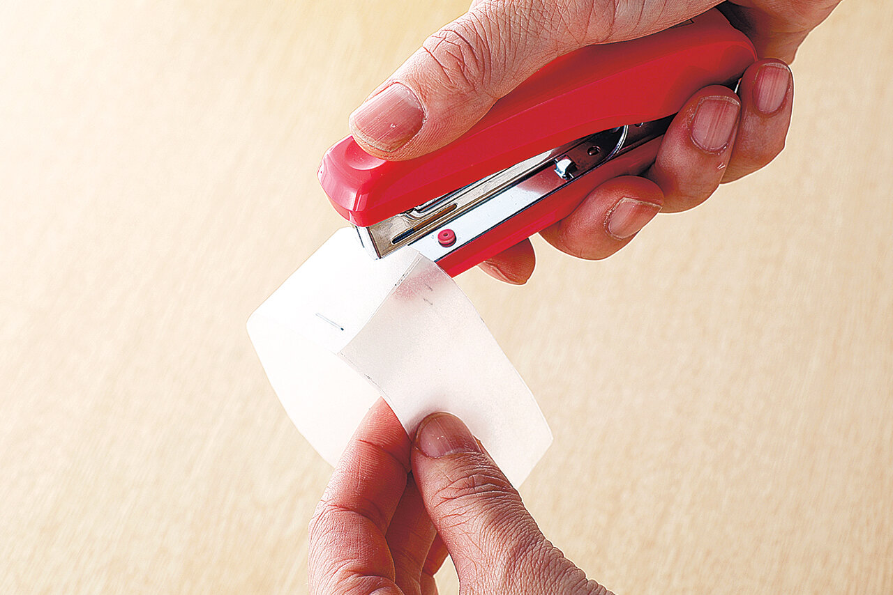 2.(1)を輪っかにし、巻き終わりを2カ所ホッチキスで留める。