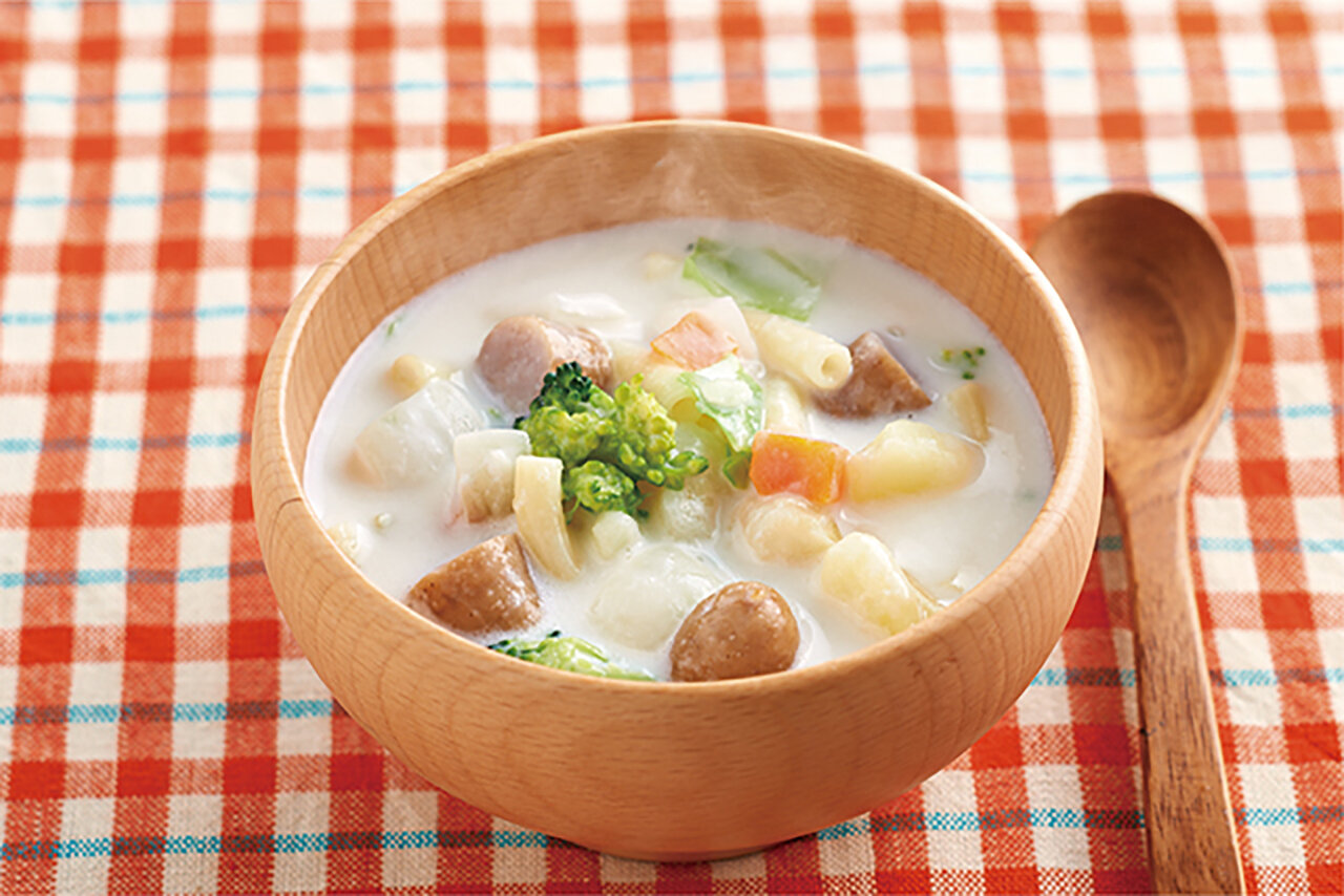 「野菜もりもりポトフ」の具材を刻んで、マカロニと牛乳をプラス! あとは塩で味を調えるだけで、キッズ向けスープのできあがり。