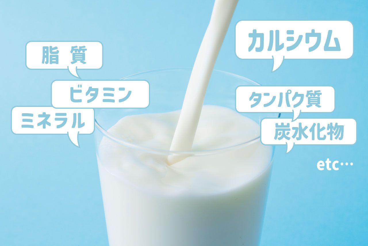 そして、牛乳が持つ栄養素はカルシウム(ミネラルの一種)だけじゃありません!実は、たんぱく質・炭水化物、脂質、ビタミン、ミネラルの5大栄養素も含まれているんです(スゴイ!)。バランスよく栄養を摂取したいときにぴったりの食品なんですよ~!
