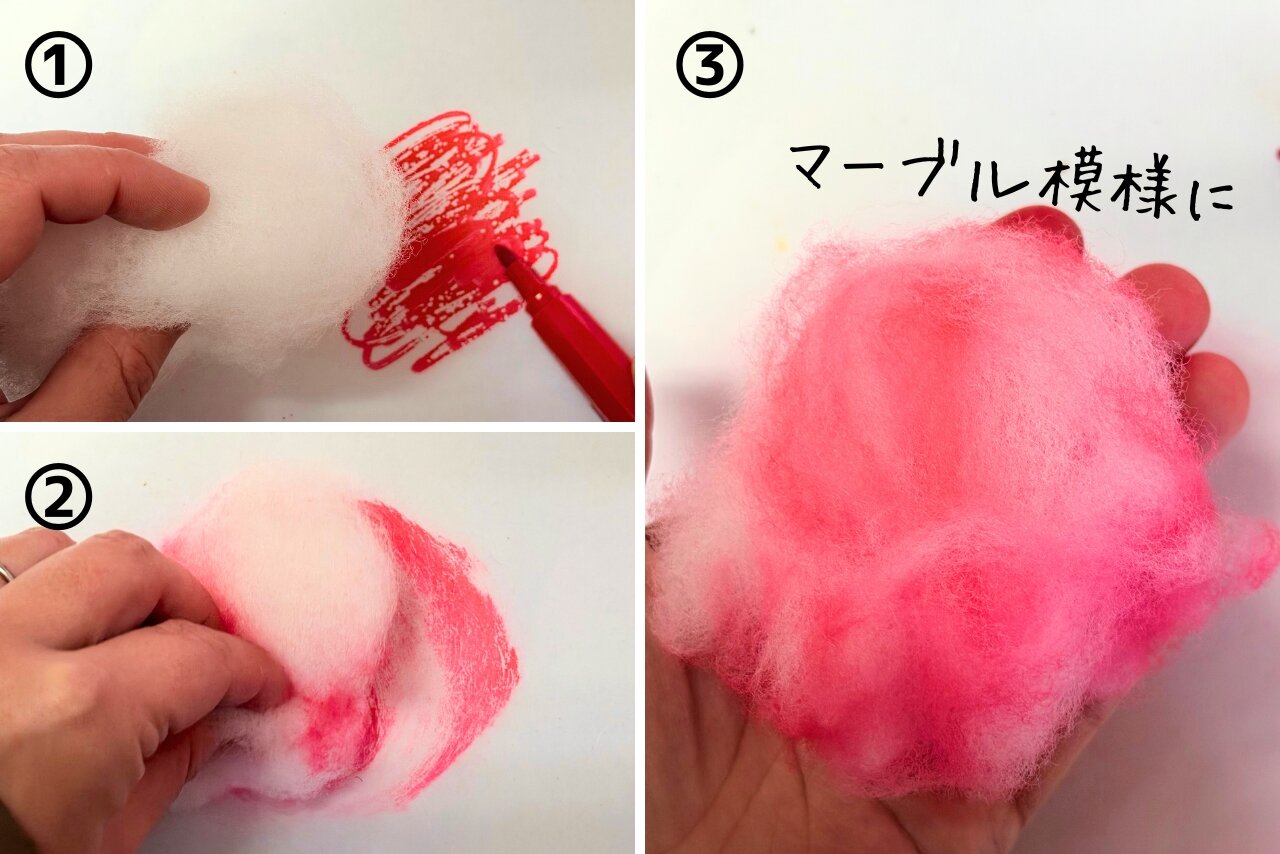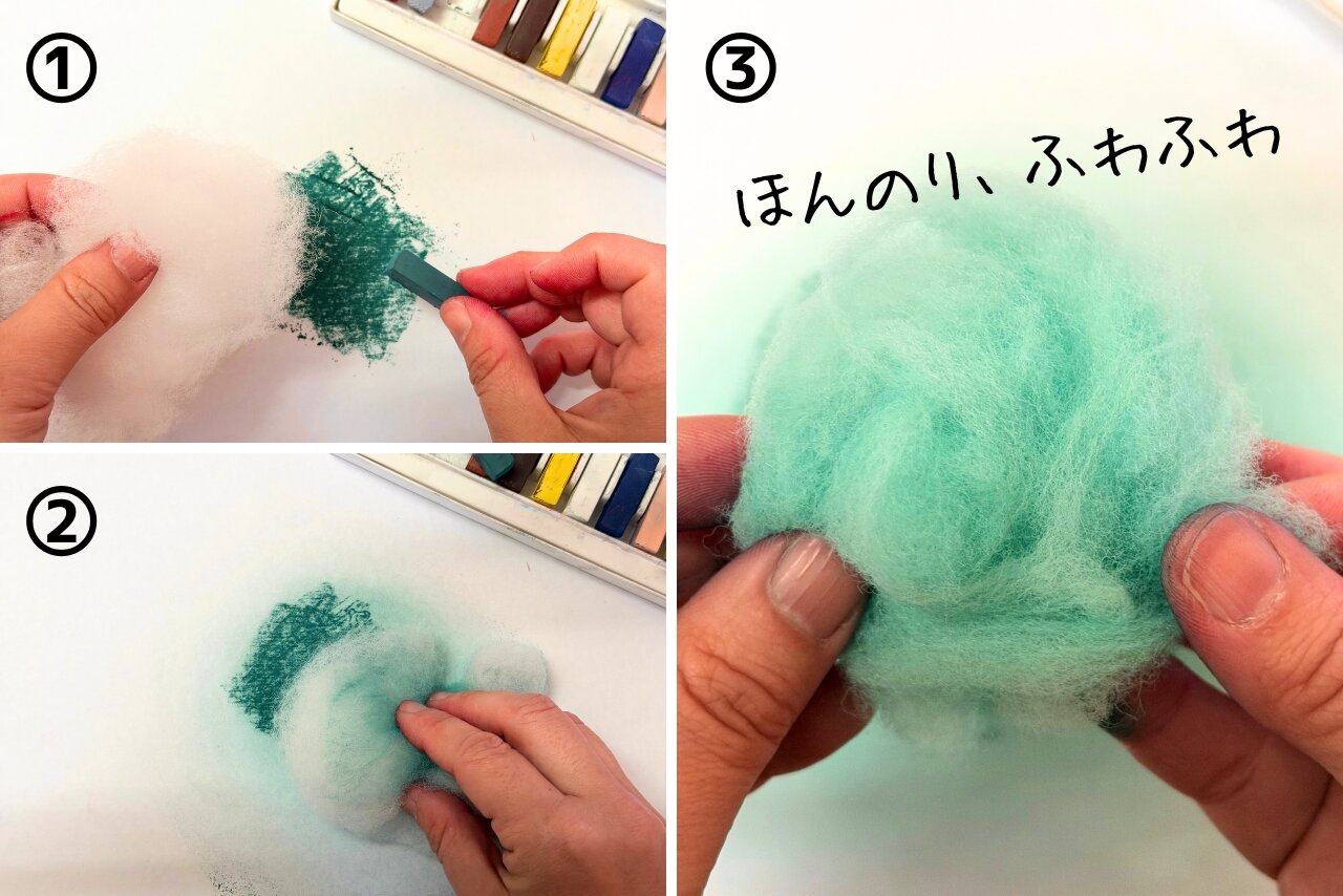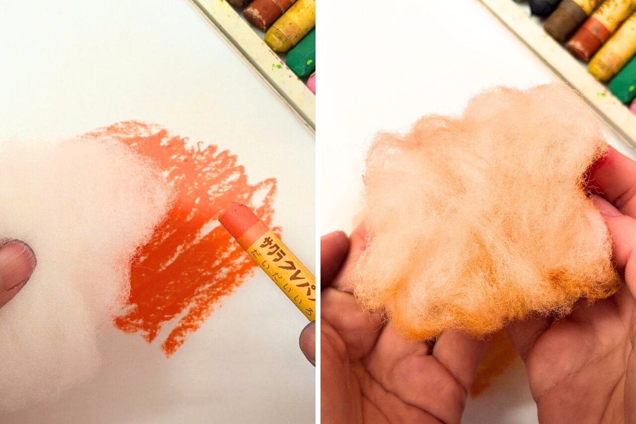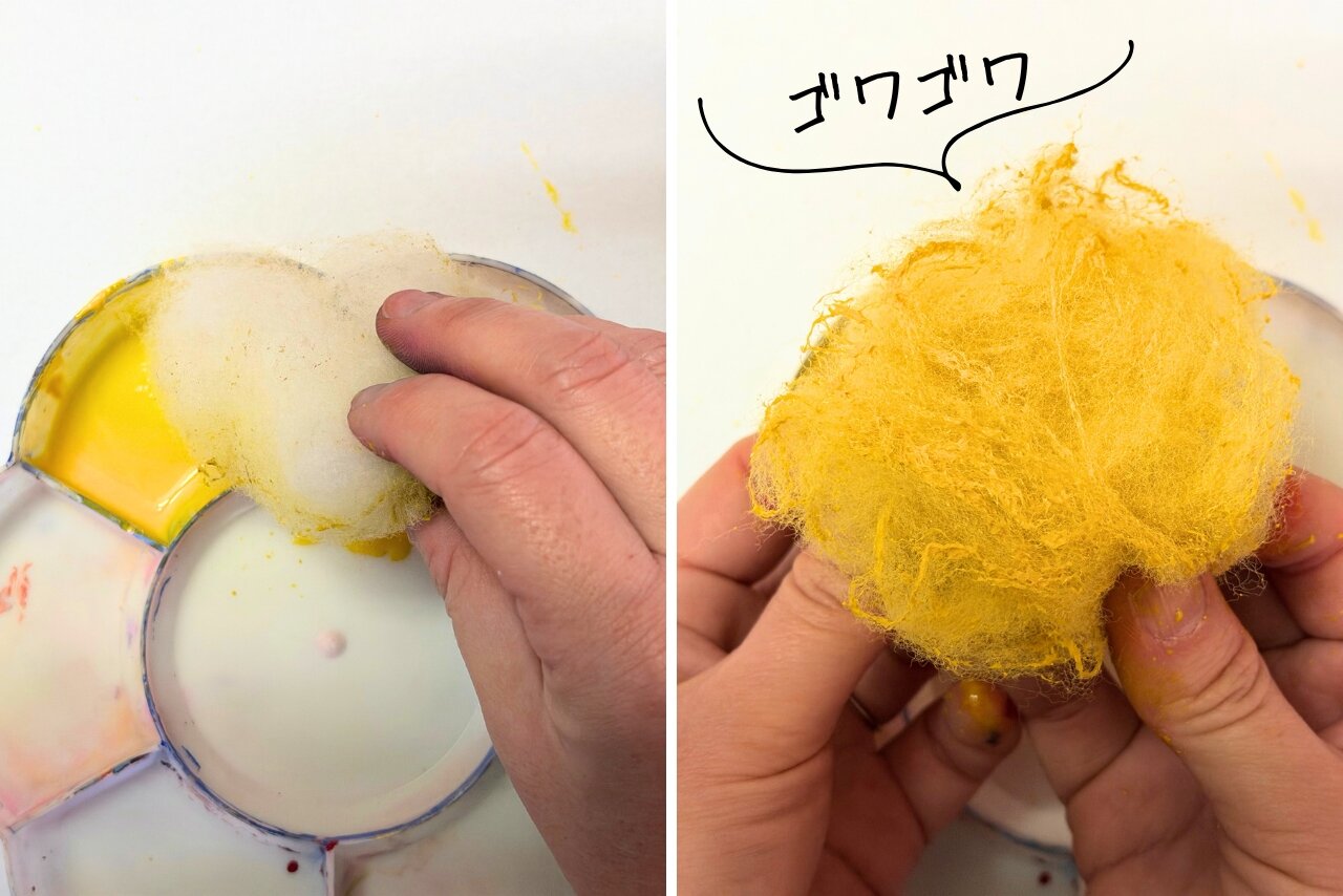 綿は、そのふわふわとした感触から色を付けるのが難しい素材です。そこで今回は3種類の画材を使って色付けを試してみました! 画材ごとに変わる色の付き方の違いに注目してみてくださいね。