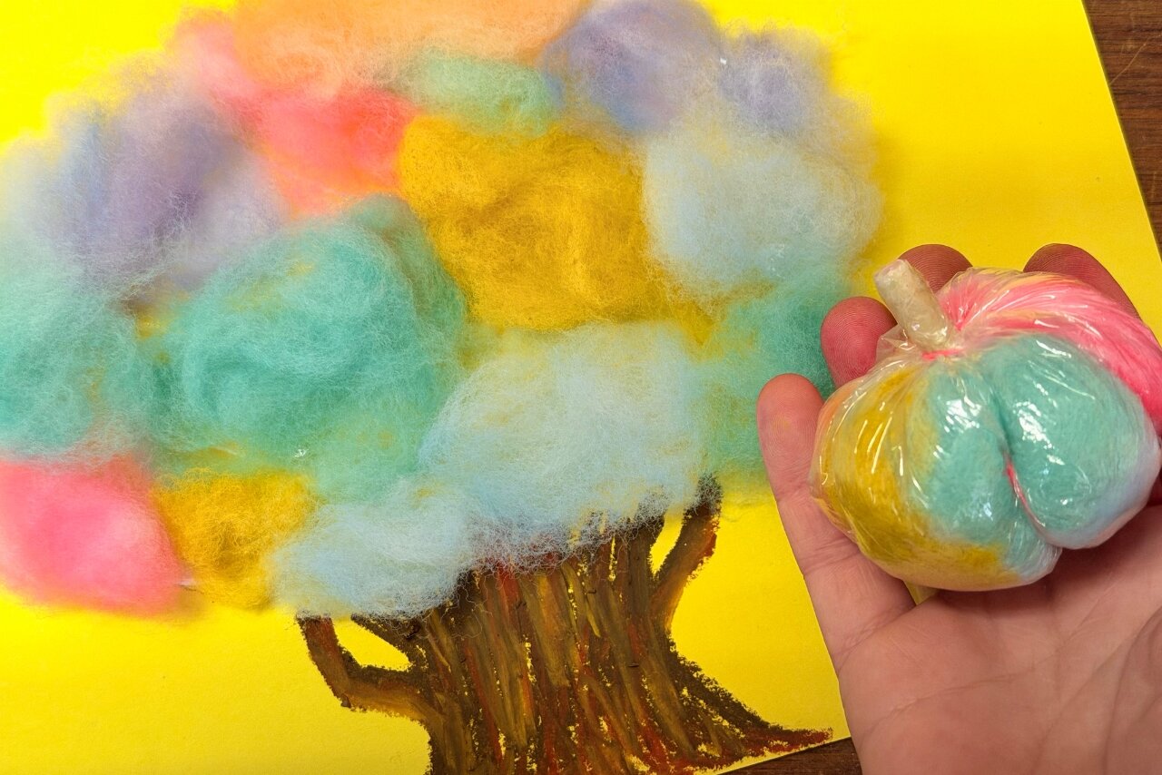 色付けした綿を色画用紙に貼ってカラフルな木を、ビニール袋に入れてカラフルカボチャを作ってみました。