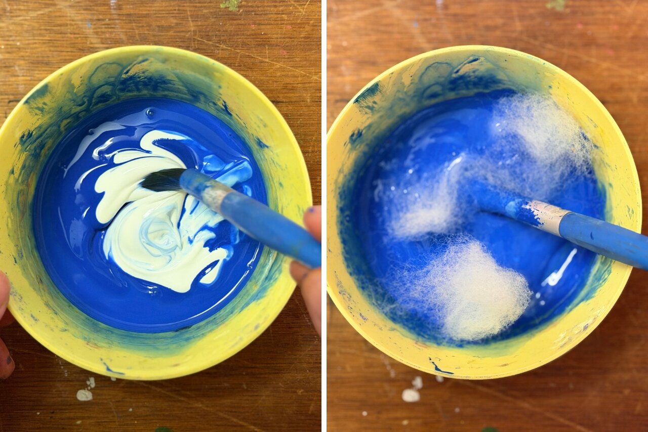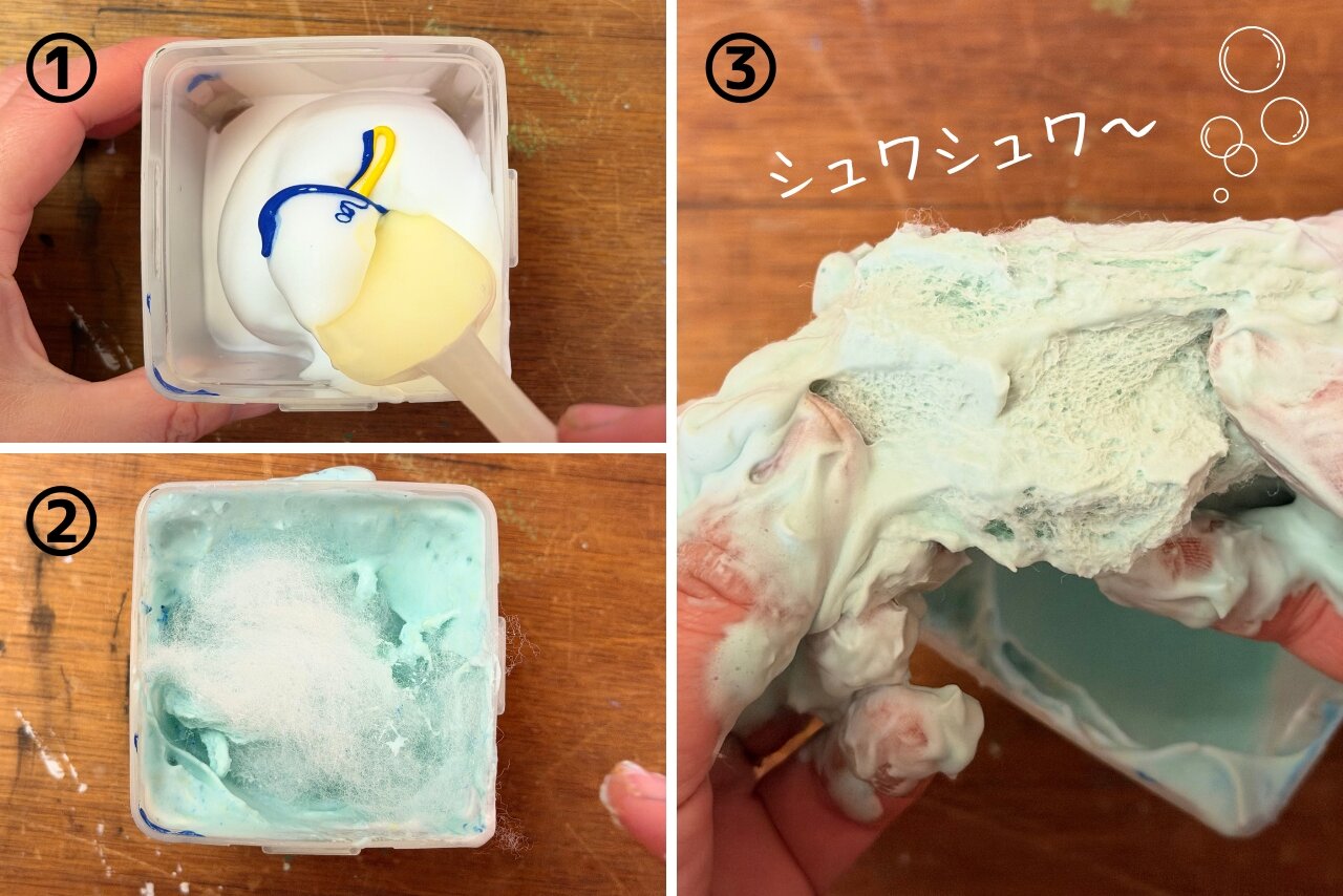 今回は硬くてキメが細かいシェービングフォームを使いました。ハンドソープでもOKですよ! 乾いた時につぶれにくくするために、泡に洗濯糊と絵の具を入れて混ぜます(画像①)。