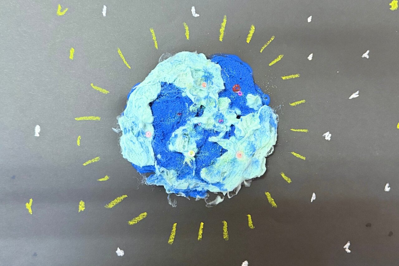 絵の具で作った青い綿と、泡で作った水色の綿を紙にくっつけると、惑星の完成!