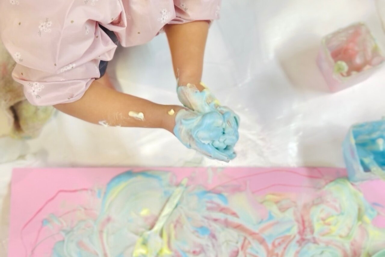 綿をいろんな材料と混ぜるとどんな感触になるのか、「絵の具」と「泡」で試してみました!
