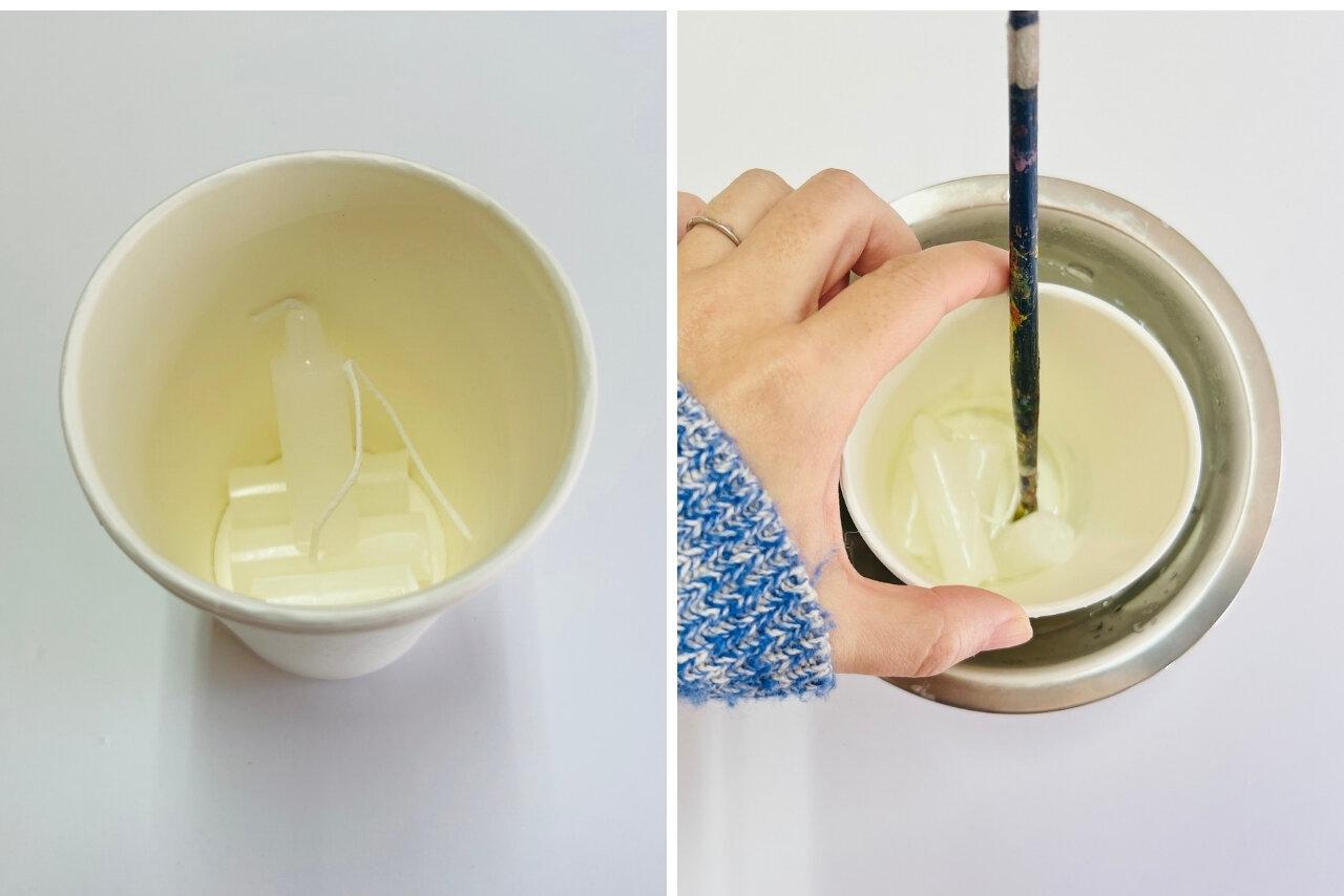 溶かしたろうで布に模様を描き、染色する「ろうけつ染め」という伝統的な染色の技法があります。今回は自宅でできるお手軽な方法をご紹介! まず、市販のろうそくを紙コップに折って入れます。ボウルに沸騰したお湯を入れ、紙コップを入れて湯せんをすると、ろうがだんだん溶けてきます。