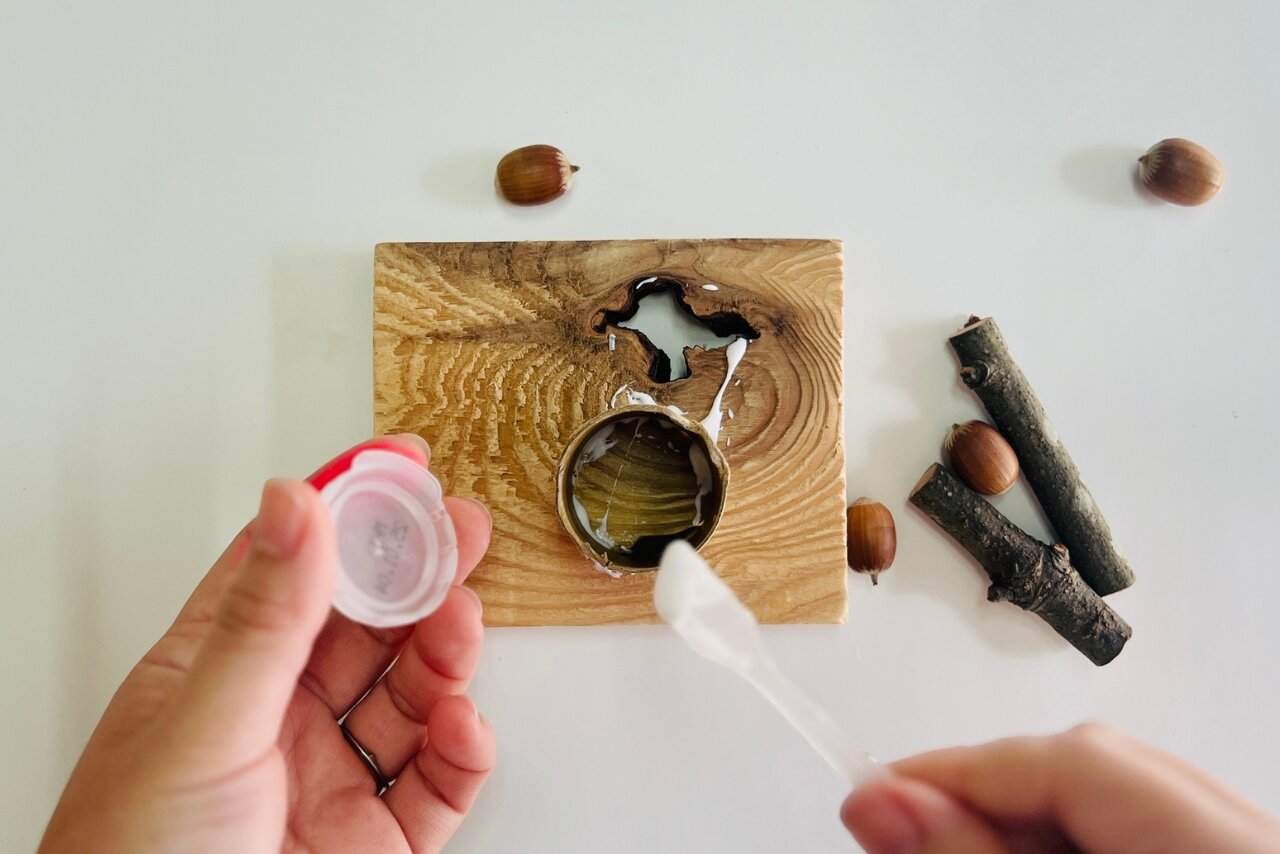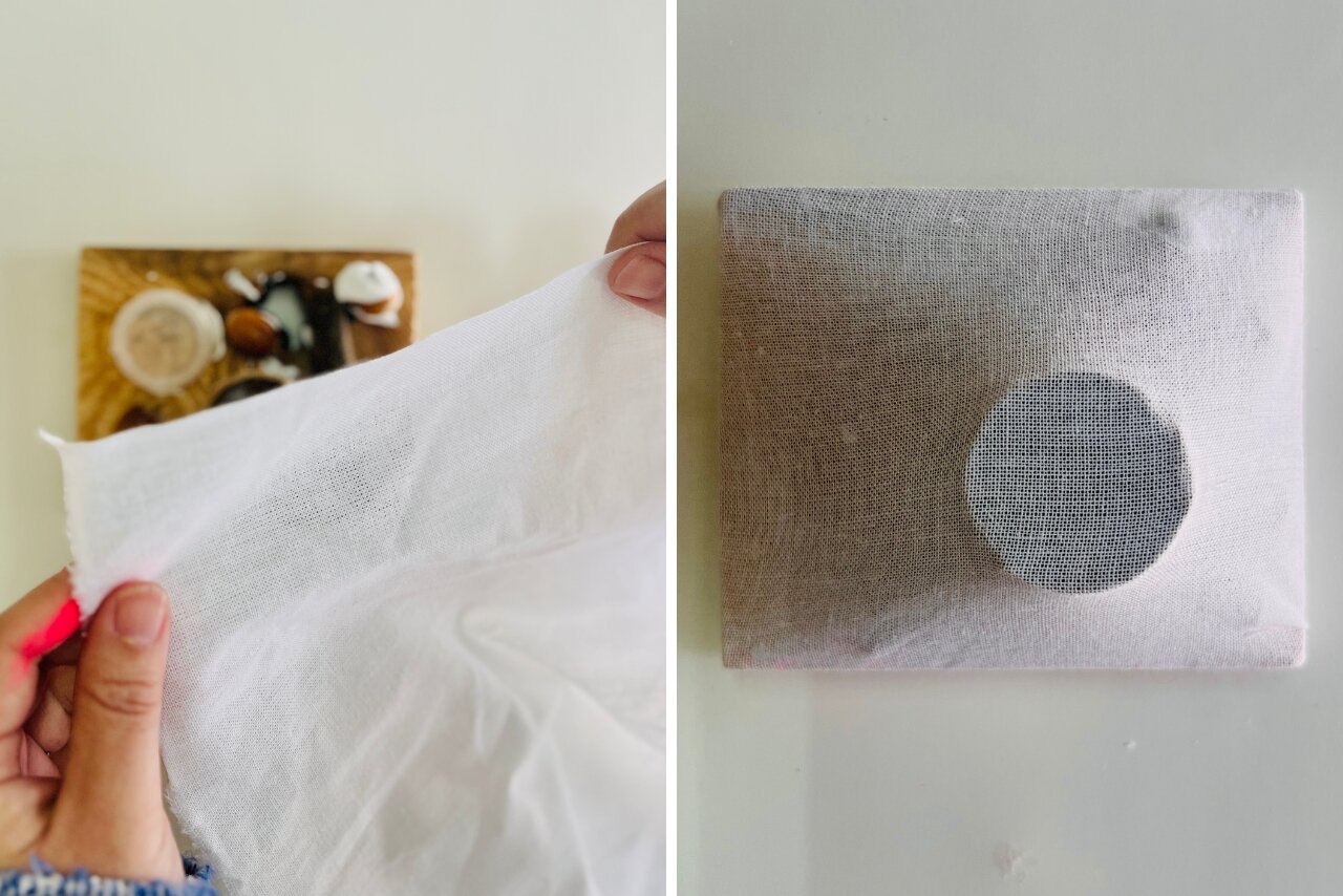 布でいろいろなものを包むと、形の面白さを発見できます。木の板にキャップや使い終わったテープの芯など、いろいろな廃材をのせてボンドでくっつけていきましょう!
