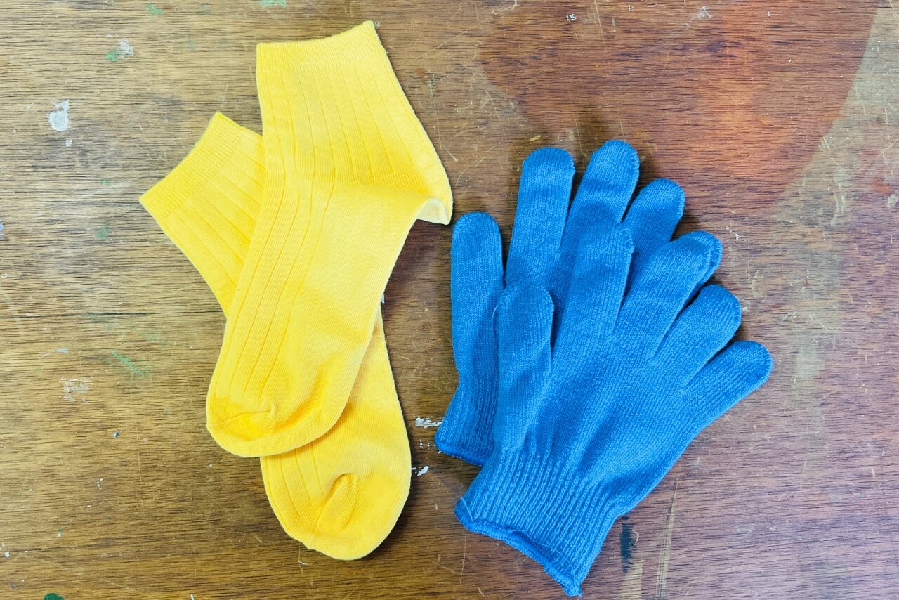 わたなどの柔らかいものを入れるとふわふわに、紙などの少しだけ硬いものを入れるとゴツゴツになります。本来入るべきものではないものが入った状態の靴下や手袋は、それだけでオブジェみたい。何に見えるかな?