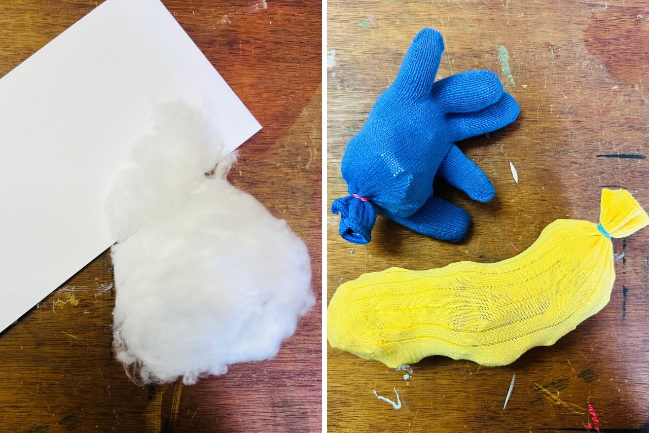 靴下や手袋など、袋状のものにいろいろなものを詰め込んで立体作品にしても面白いです!