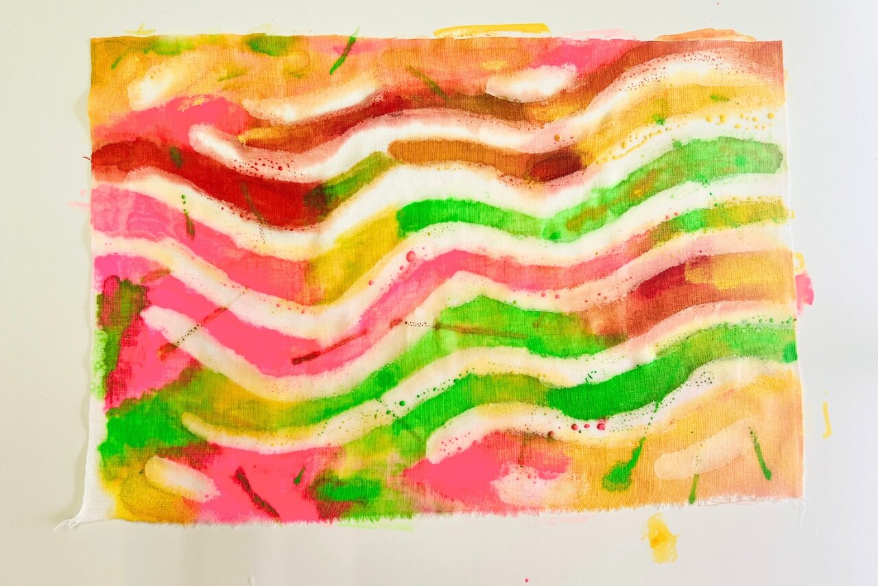 ろうが固まったら、ろう以外のところを埋めていくように絵の具を塗っていきます。今回は水で溶いたアクリル絵の具を使って色をつけてみました。
