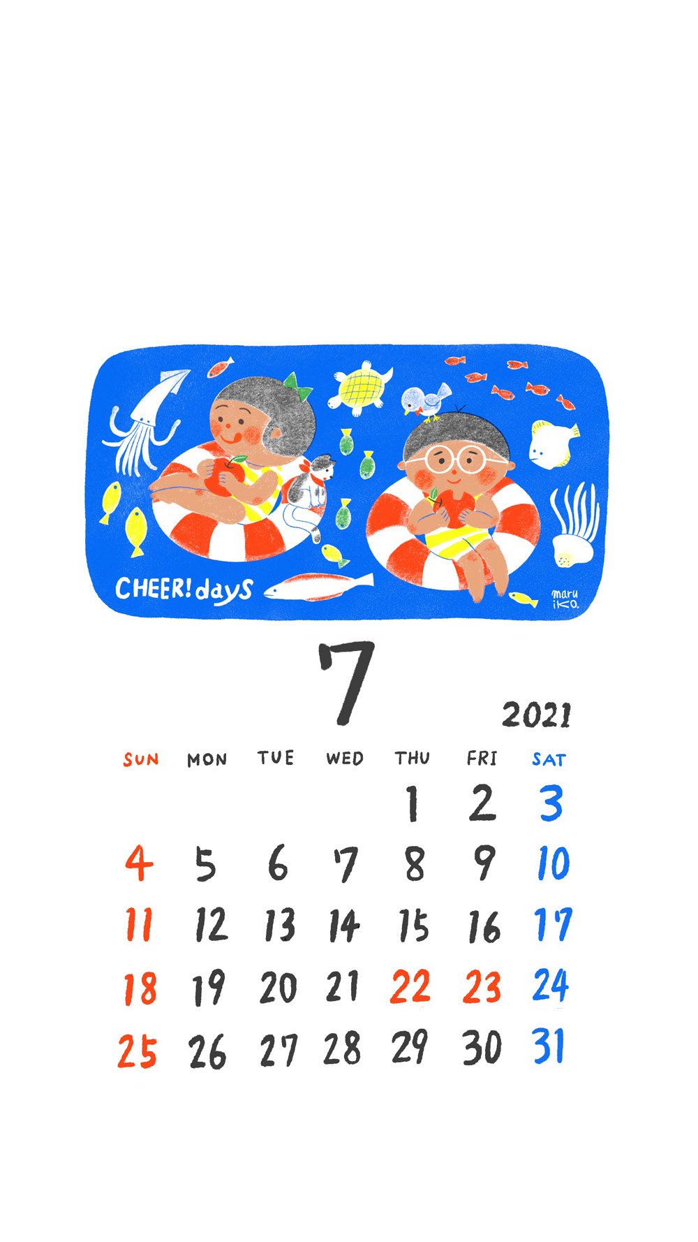 オリジナルカレンダーを描き下ろしてくださっているのは、福岡県嘉麻市在住のイラストレーター・maruiko(まるいこ)さん。今月は、チアちゃんとデイズくんが海でプカプカ。とっても気持ちよさそうです♪