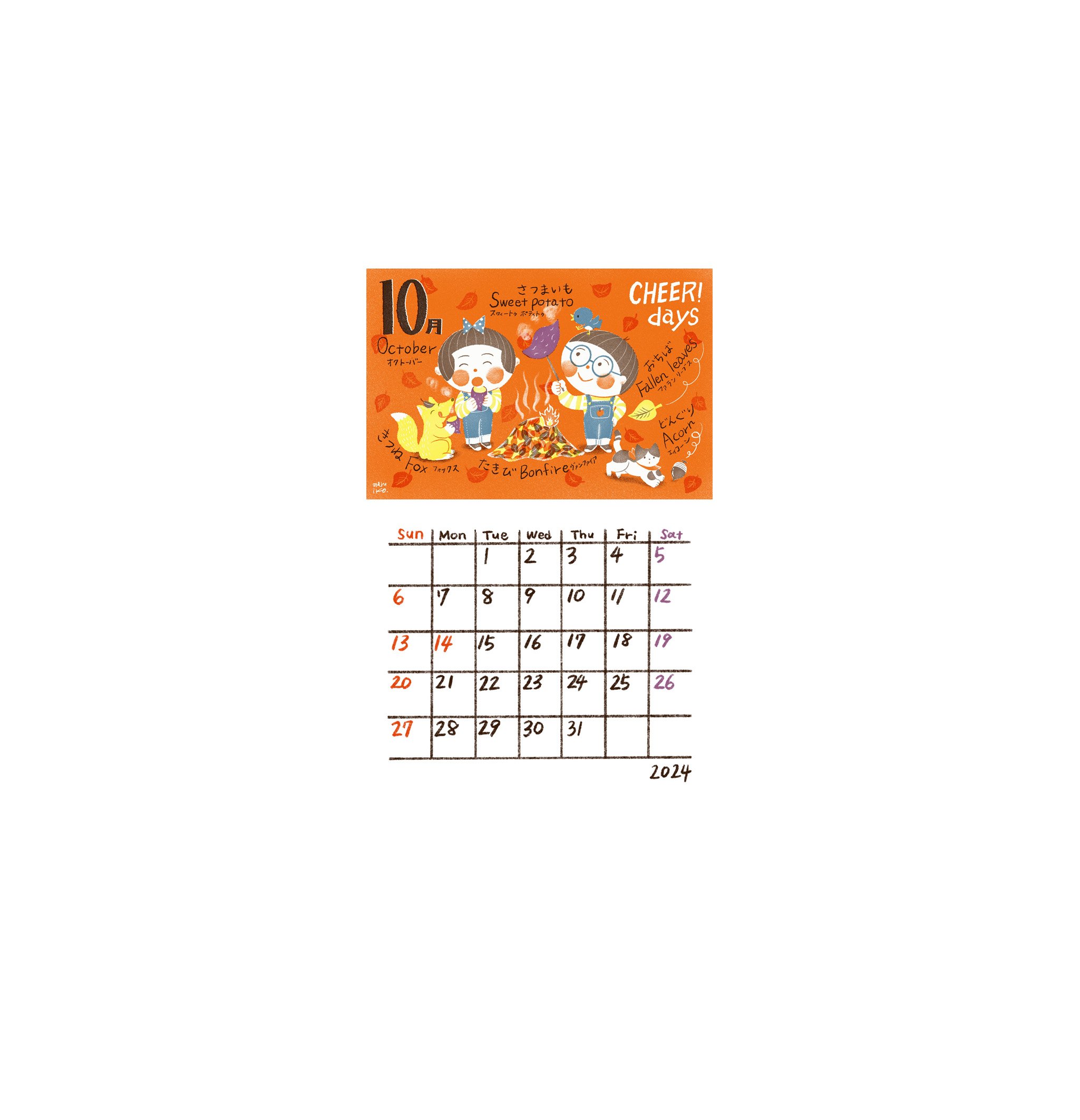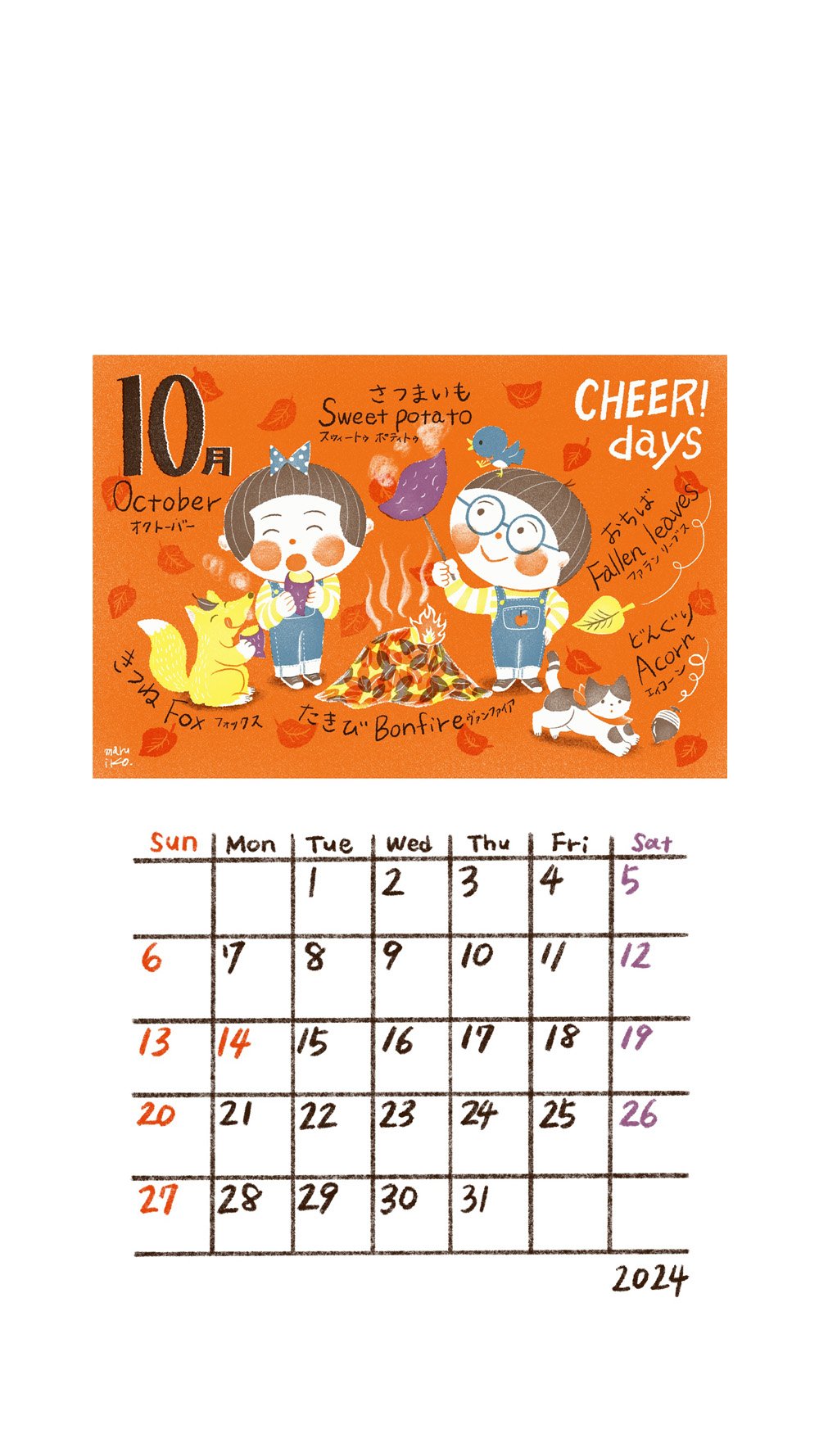 さて、楽しく学べて予定が書き込めるオリジナルカレンダー! 今月はたき火を囲んで秋を満喫しているチアちゃんたち。お芋も焼けておいしそう〜♪