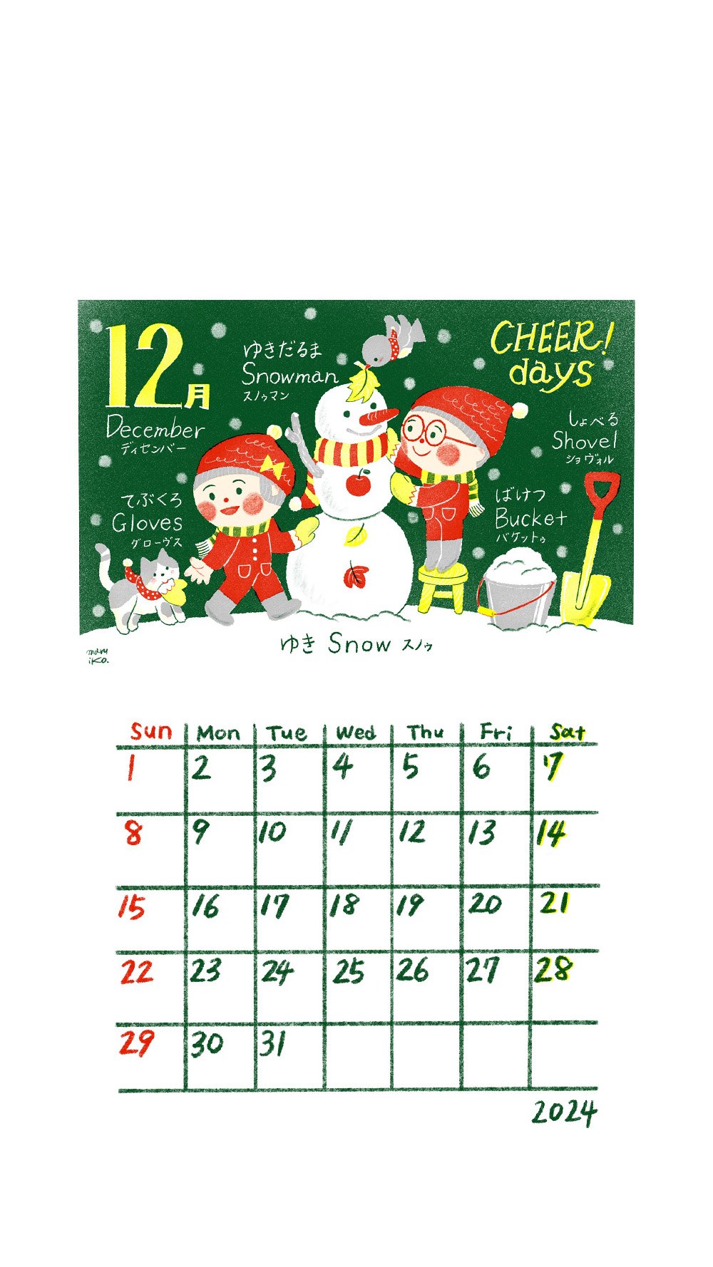 さて、楽しく学べて予定が書き込めるオリジナルカレンダー! 今月は、みんなで力を合わせてゆきだるまを作ったチアちゃんたち。お揃いのしましまマフラーを巻けば、スノーマンもうれしくなってすぐにでも動き出しそうですね♪