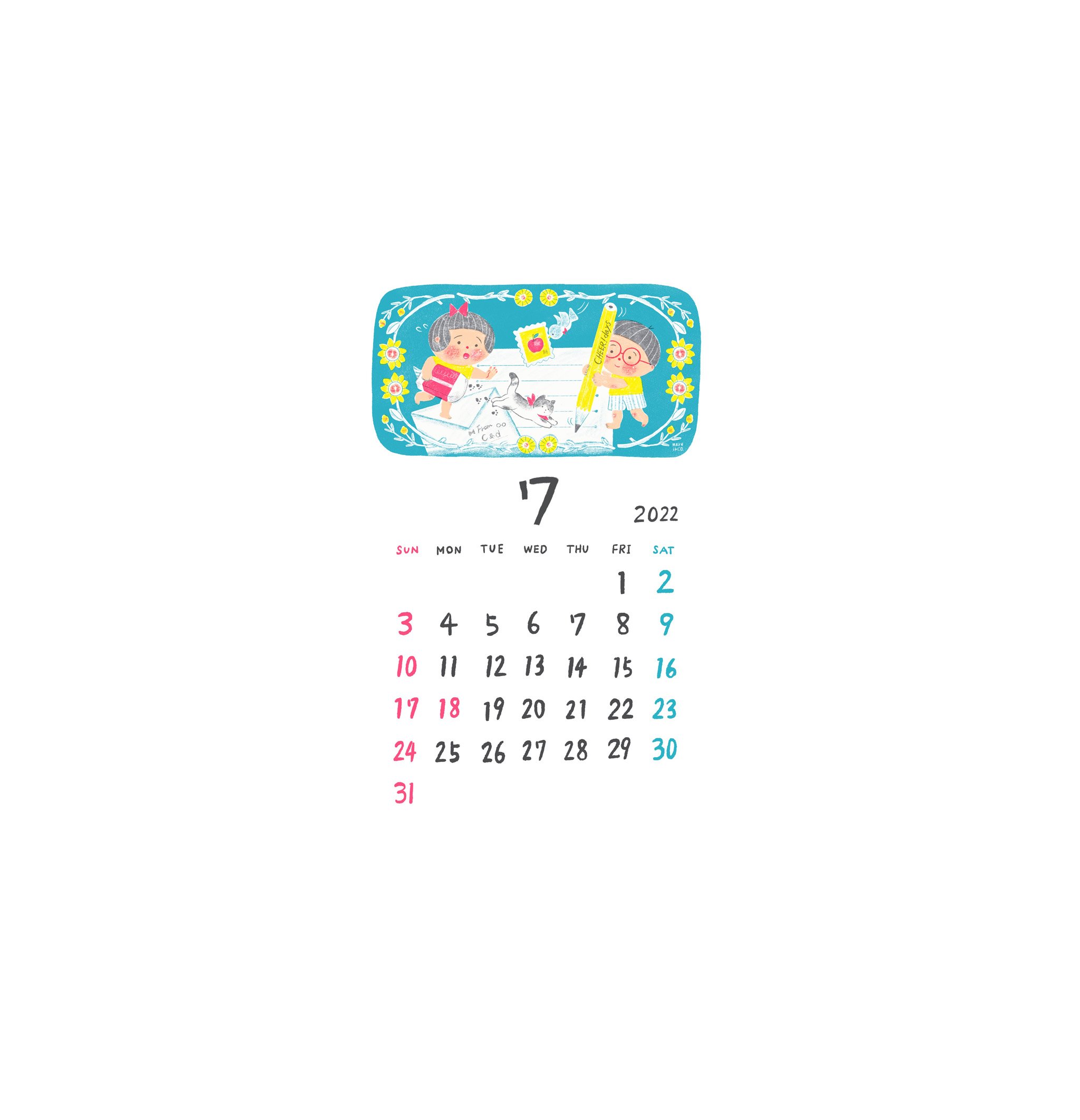 オリジナルカレンダーを描き下ろしてくださっているのは、福岡県嘉麻市在住のイラストレーター・maruiko(まるいこ)さん。今月は7月23日の「ふみの日」にちなんで、お手紙を書くチアちゃんとデイズくん。ねこのフクちゃんも加わって、みんなで誰にお手紙を出すのかな?