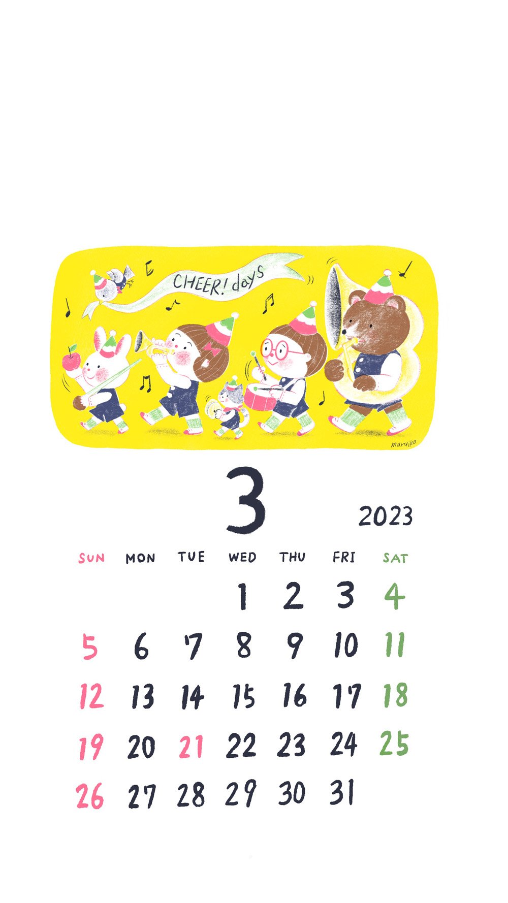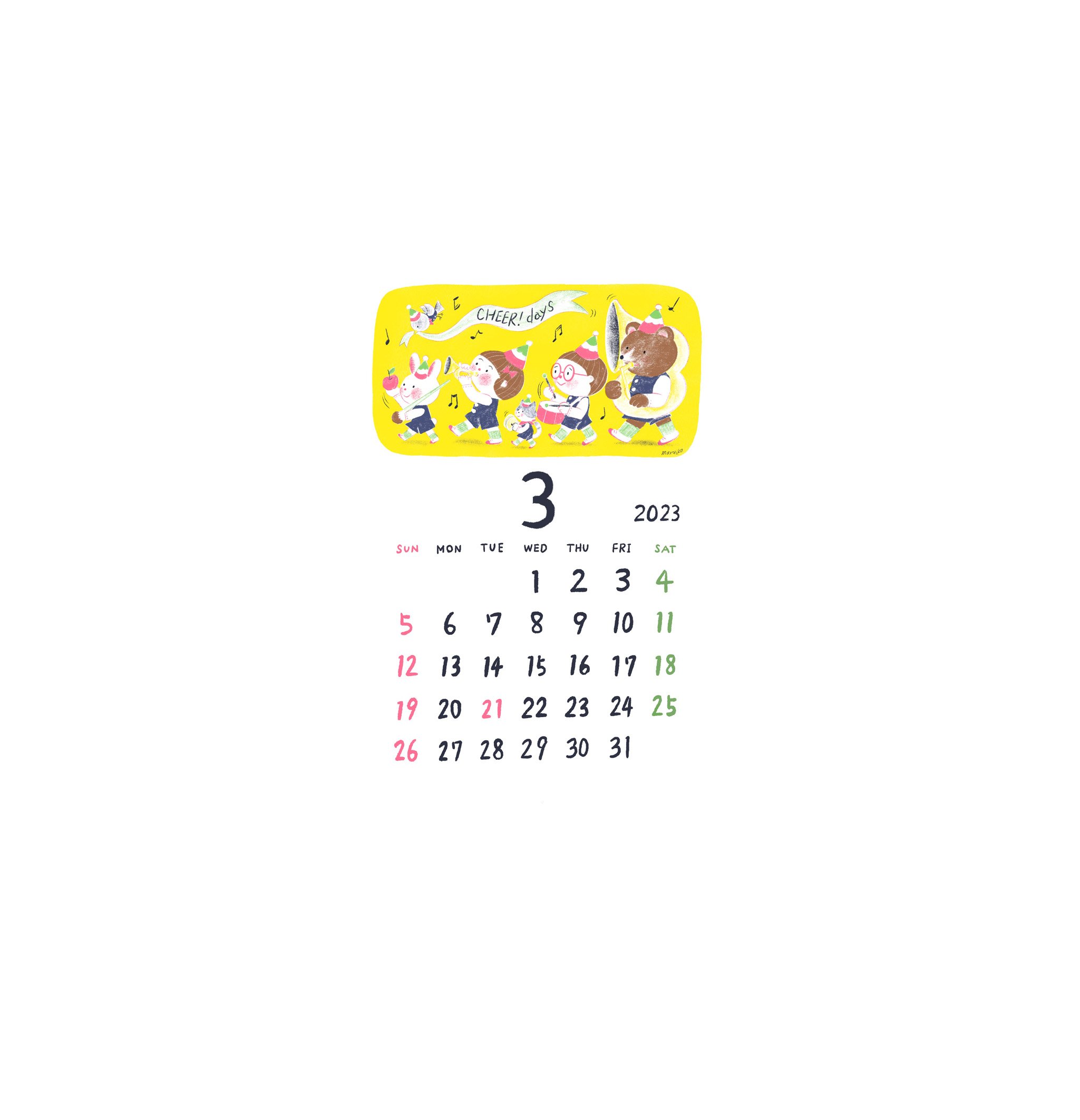 オリジナルカレンダーを描き下ろしてくださっているのは、福岡県嘉麻市在住のイラストレーター・maruiko(まるいこ)さん。今月は3月1日の「行進曲の日」にちなんで、マーチングをするCHEER!daysファミリーとお友達の動物たちです。みんな楽しそうに演奏していて、今にも音が聞こえてきそうですね♪